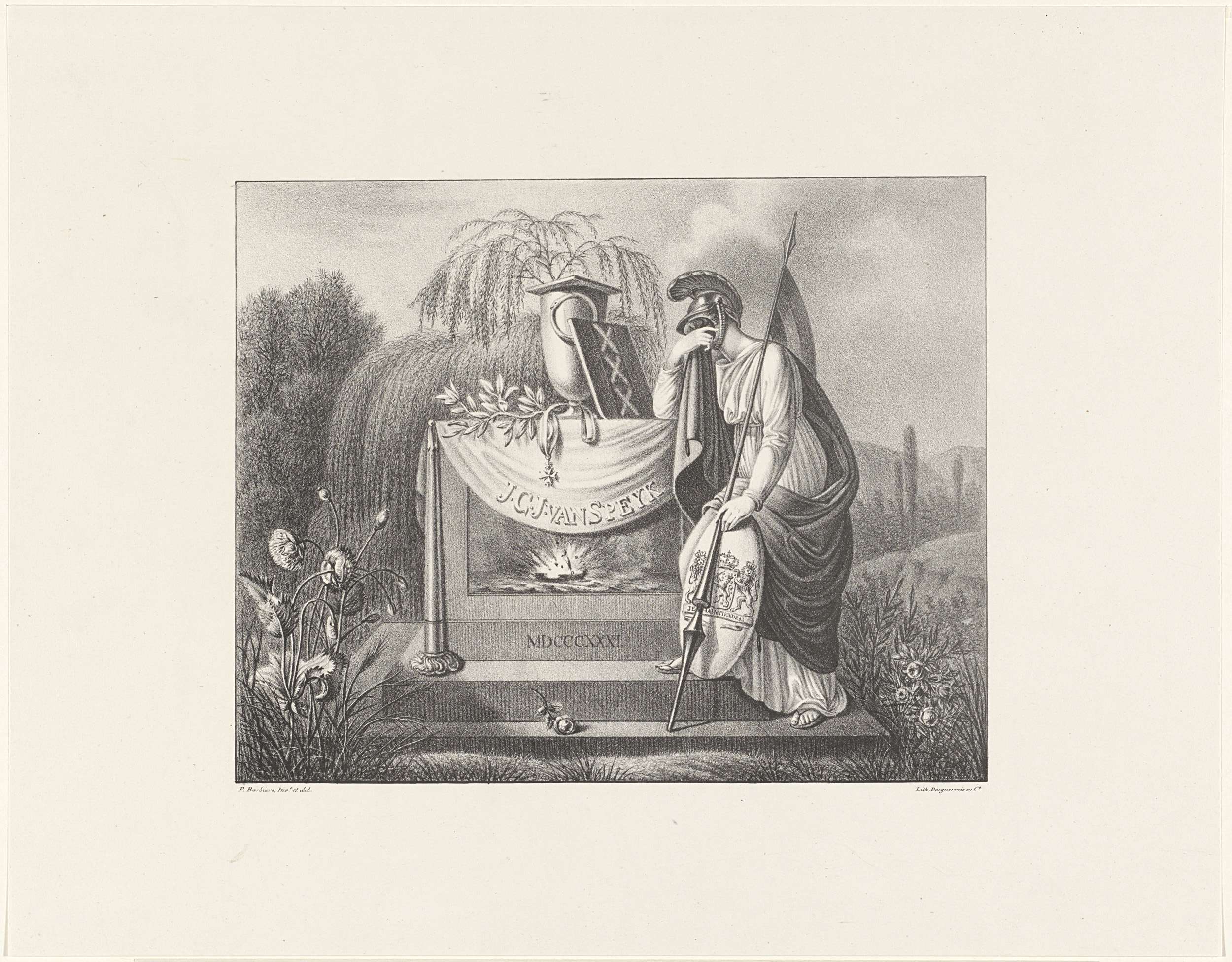 Allegorisch grafmonument voor Jan van Speyk, 1831. De Nederlandse Maagd met Nederlandse vlag en rijkswapen treurend bij het graf. Op de voorzijde van het graf een voorstelling van het in de lucht springen van de kanonneerboot van Jan van Speyk op de Schelde voor Antwerpen op 5 februari 1831. Bovenop het graf een urn, olijftak, ...