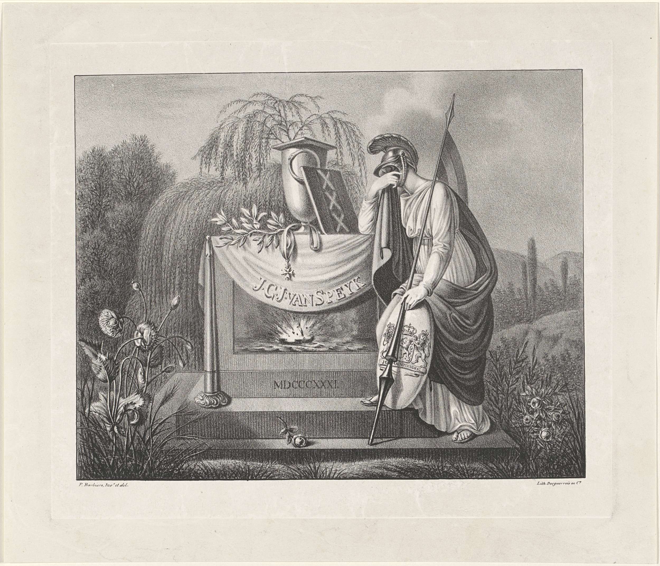 Allegorisch grafmonument voor Jan van Speyk, 1831. De Nederlandse Maagd met Nederlandse vlag en rijkswapen treurend bij het graf. Op de voorzijde van het graf een voorstelling van het in de lucht springen van de kanonneerboot van Jan van Speyk op de Schelde voor Antwerpen op 5 februari 1831. Bovenop het graf een urn, olijftak, ...