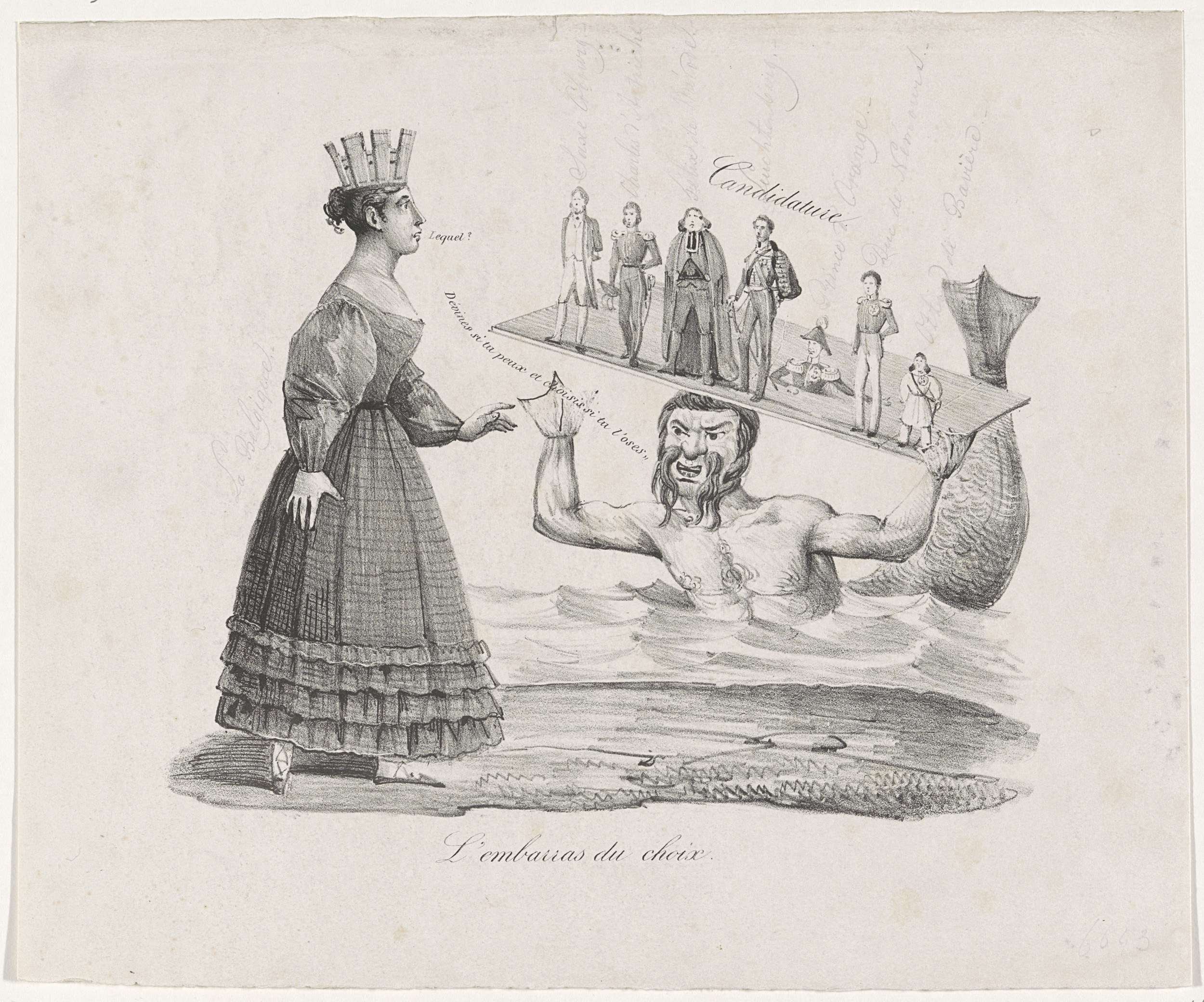 Spotprent op de koningskeuze in België, februari 1831. De Belgische Maagd in verlegenheid bij het kiezen tussen de kandidaten voor de Belgische kroon. Een zeemeerman houdt een plank omhoog waarop de zeven kandiaten staan.