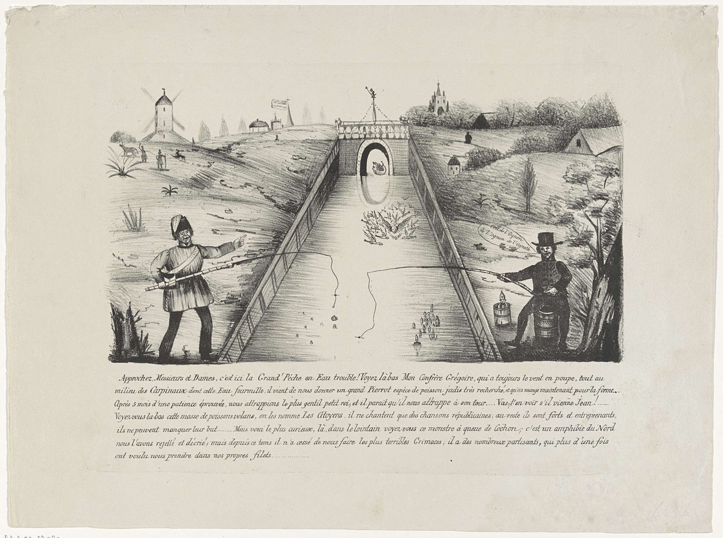 Spotprent op de intriges van de Belgische Orangisten tijdens de onderhandelingen over de koningskeuze in België, februari 1831. Aan weerszijden van een kanaal vissen twee Belgen naar een nieuwe koning. De man links gekleed als een Belgische opstandeling, de man rechts vist bisschoppen uit het water. Verderop een school vligende vissen, onder de brug een ...