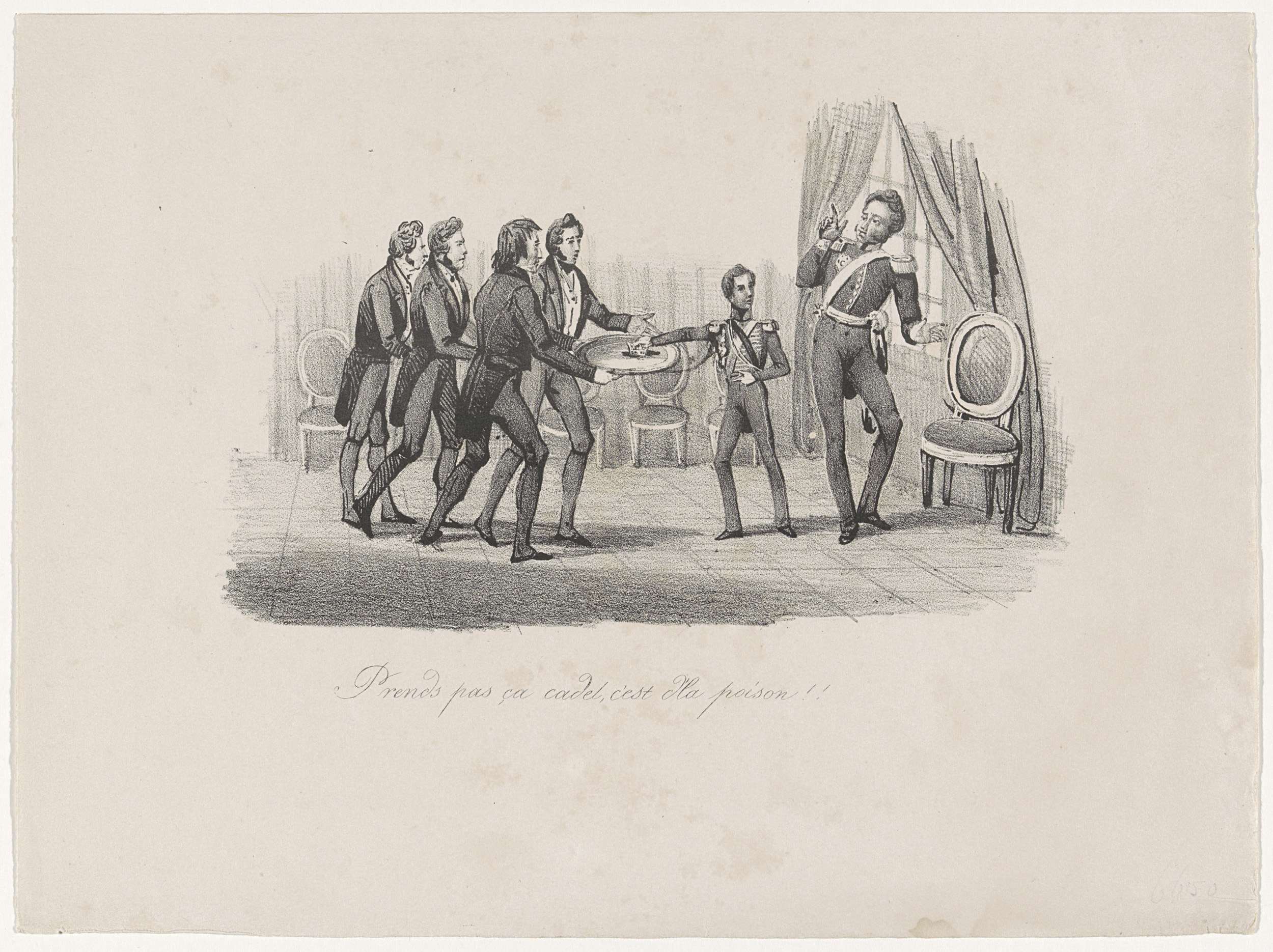 Spotprent op het bezwaar van de Franse koning Lodewijk Filips tegen het aanvaarden door zijn zoon Lodewijk van Orléans (hertog van Nemours) van de Belgische kroon, februari 1831. Vier Belgen bieden de hertog een kroon aan, zijn vader waarschuwt hem het niet aan te nemen.