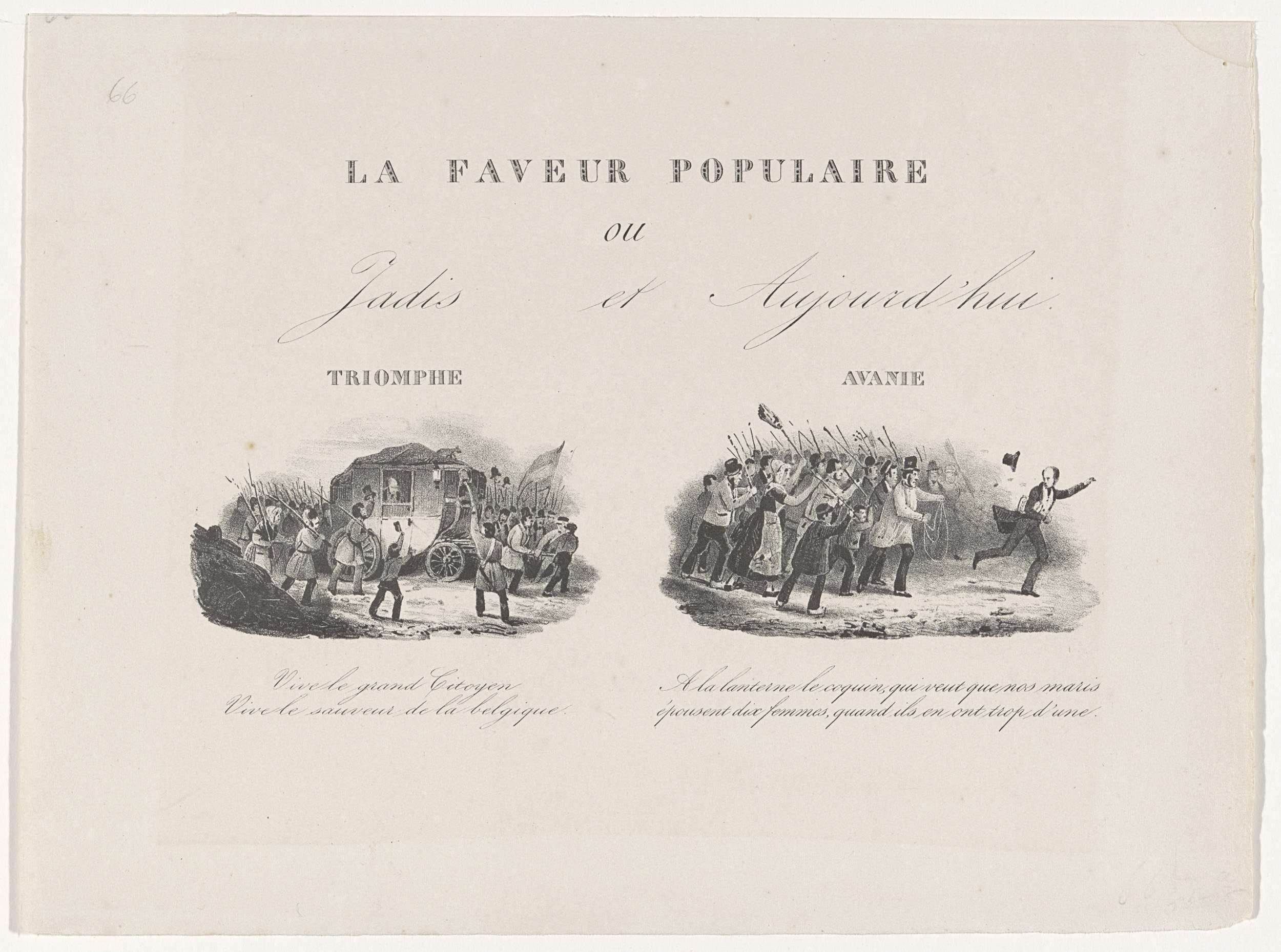Spotprent op Louis de Potter en het verlies van zijn populariteit, 22 februari 1831. Links wordt De Potter op 27 september 1830 te Brussel triomfantelijk binnen gehaald. Rechts moet hij vluchten voor een boze menigte die hem wil ophangen (22 februari 1831). Met tweeregelige onderschriften.