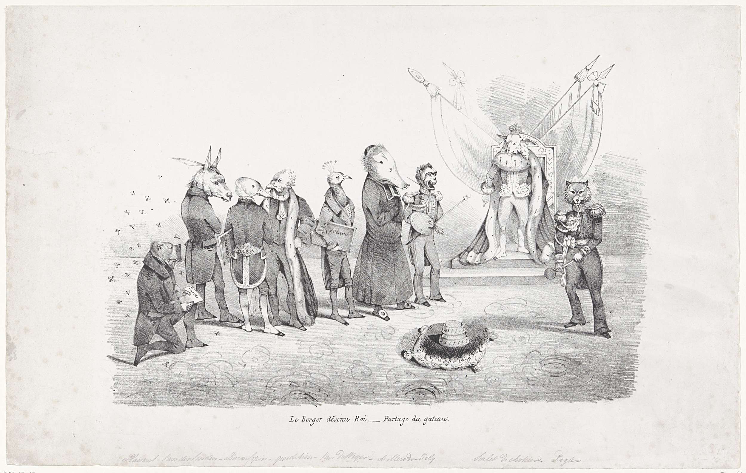 Spotprent op het regentschap van Surlet de Chokier en zijn ministers. Surlet de Chokier werd op 24 februari 1831 tot regent van België benoemd. De regent en zijn ministers zijn voorgesteld als dieren. Surlet de Chokier staande voor zijn troon als een schaap, rechts zijn adjudant Rogier als vos. Links een geknielde hond (Plaisant, chef ...