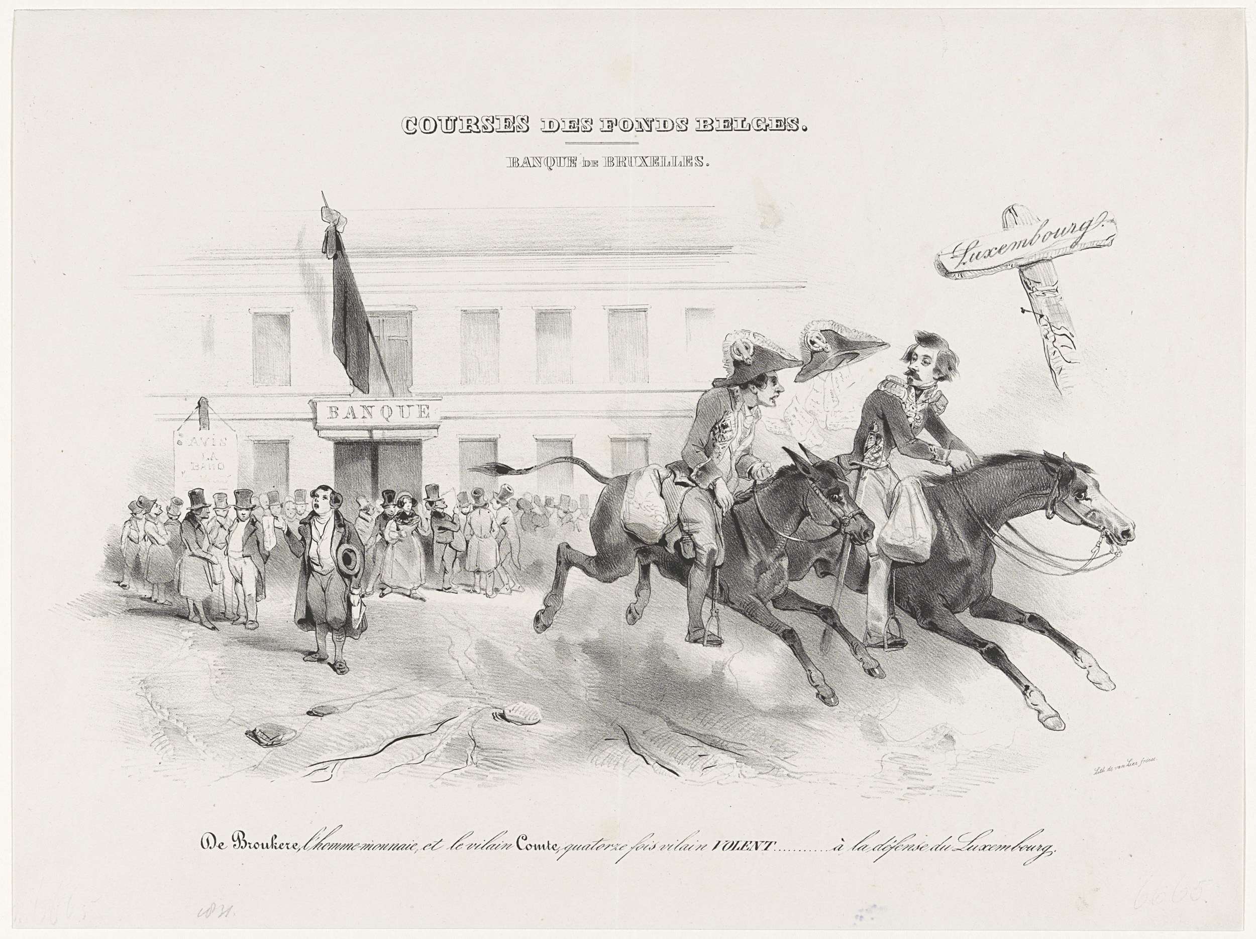 Spotprent op de Belgische bankdirecteuren De Brouckere en Graaf de Vilain XIV die als Don Quichot en Sancho Panza met volle geldzakken vluchten richting Luxemburg. Op de achtergrond de Bank van Brussels waar de rouwvlag is uitgestoken en waar een oploop van volk is ontstaan. De prent is in 1838 uitgegeven.