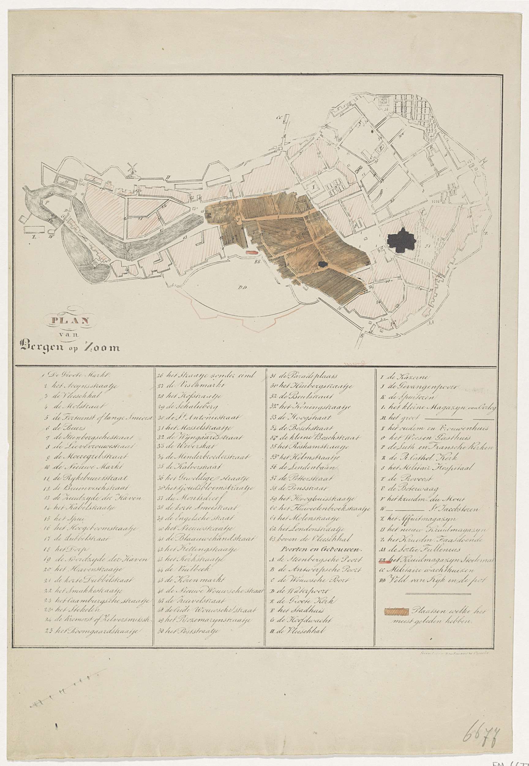 Plattegrond van Bergen op Zooom waarop de schade is aangegeven aangericht door de ontploffing in de kruitmagazijn van laboratorium Stoelemat te Bergen op Zoom, 29 maart 1831. Delen van de kaart met kleuren aangegeven. Met in vier kolommen de legenda 1-63, A-Z en AA-DD.