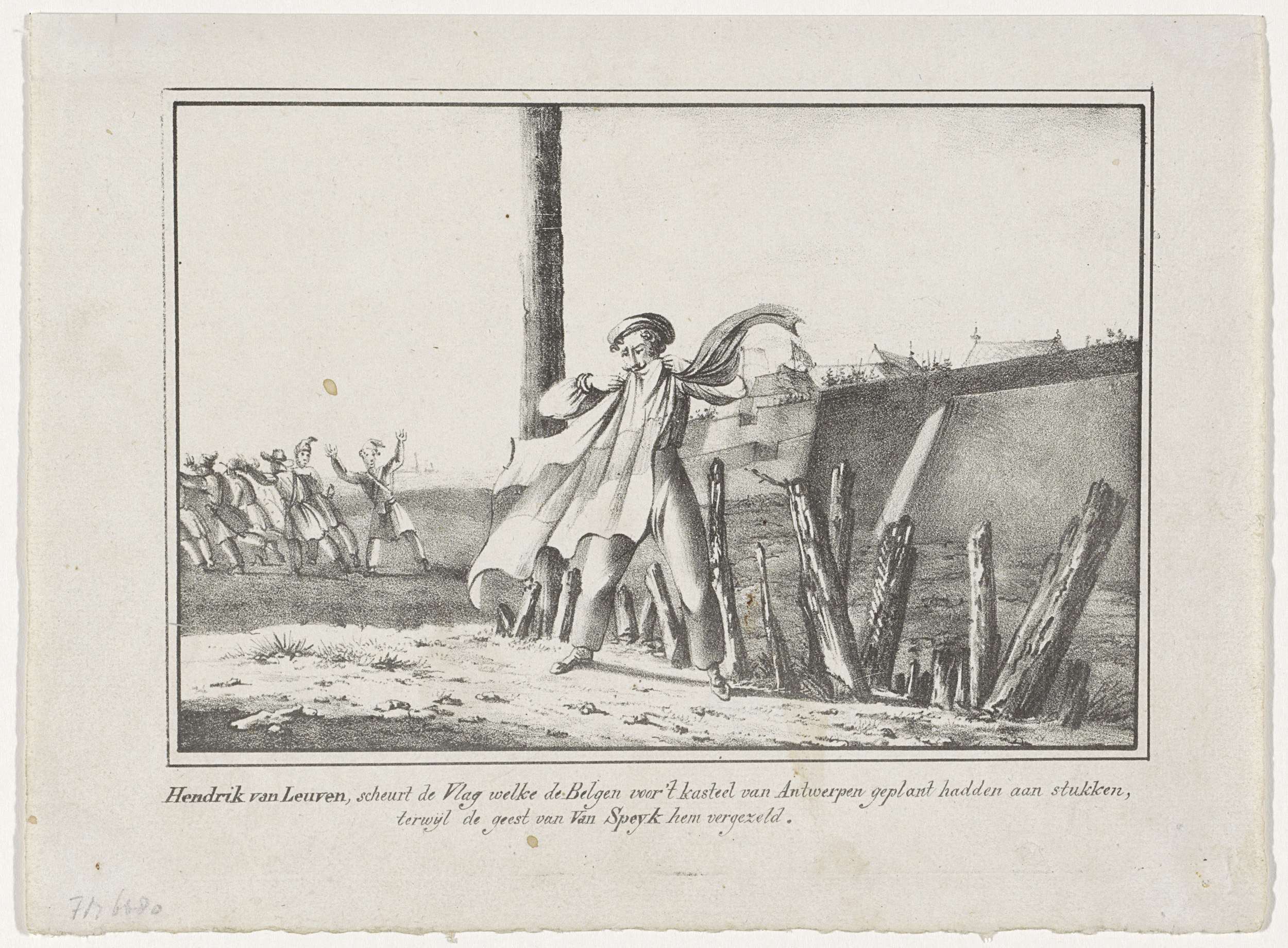 De Nederlandse fuselier Hendrik van Leuven verscheurt met zijn handen en tanden de Belgische vlag die door de Belgen voor de Citadel van Antwerpen was geplaatst, 26 mei 1831. Direct rechts van de man is de figuur van Jan van Speyk te ontwaren.