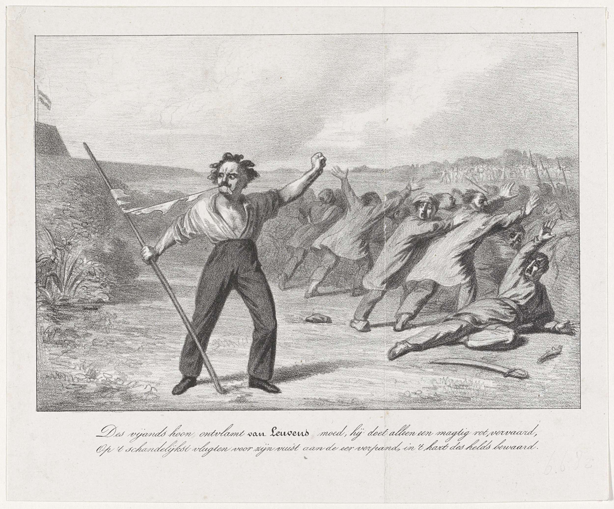 De Nederlandse fuselier Hendrik van Leuven verscheurt woest met zijn handen en tanden de Belgische vlag die door de Belgen voor de Citadel van Antwerpen was geplaatst, 26 mei 1831. Rechts vluchtende Belgen. In het onderschrift een tweeregelig vers.
