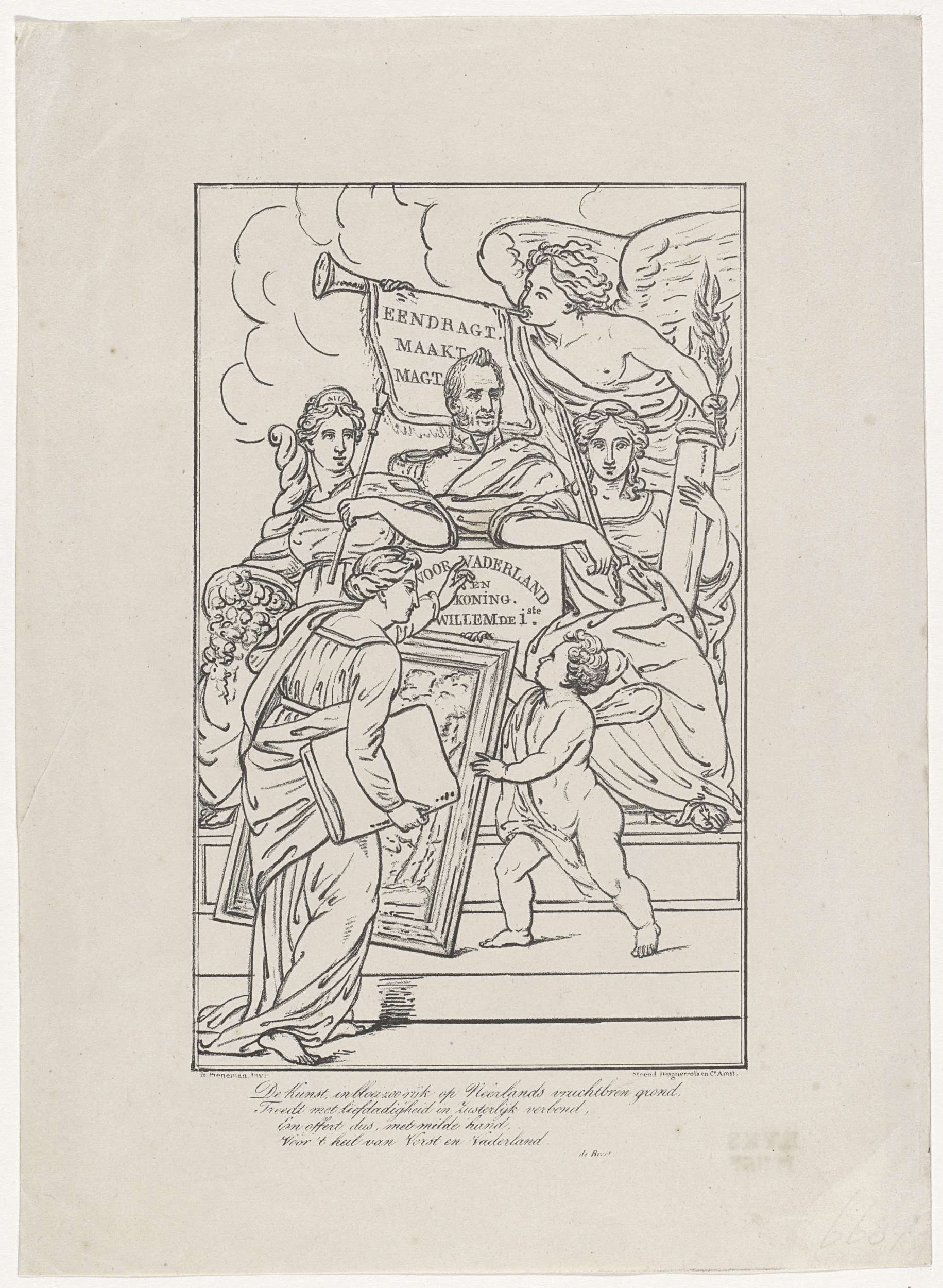 Allegorie op de verloting van kunstwerken ten behoeve van het vaderland, tentoongesteld in het Paleis van Justitie te Amsterdam van 28 april tot 9 juli 1831. Koning Willem I omringd door de personificaties van Overvloed en de Standvastigheid. Op de voorgrond de Kunst met een ge nius die een schilderij offert voor de loterij. In ...