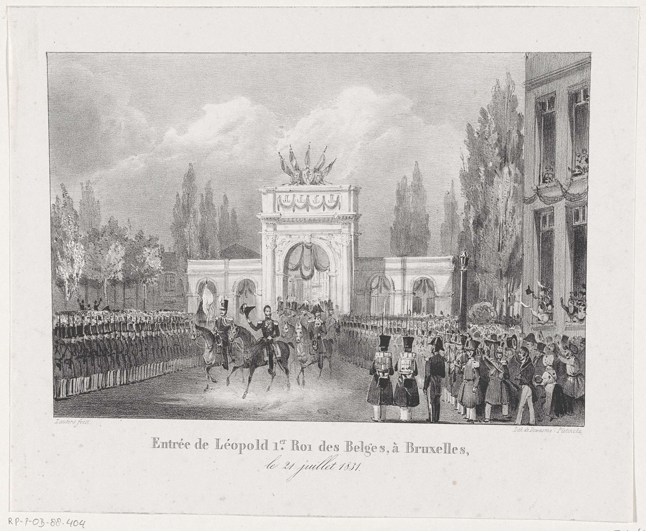Ceremoniële aankomst van koning Leopold I bij het Koningsplein in Brussel, 21 juli 1831. De koning rijdt met zijn gevolg door de versierde Porte d'Anvers (de vroegere Willemspoort). Zie ook de pendant.