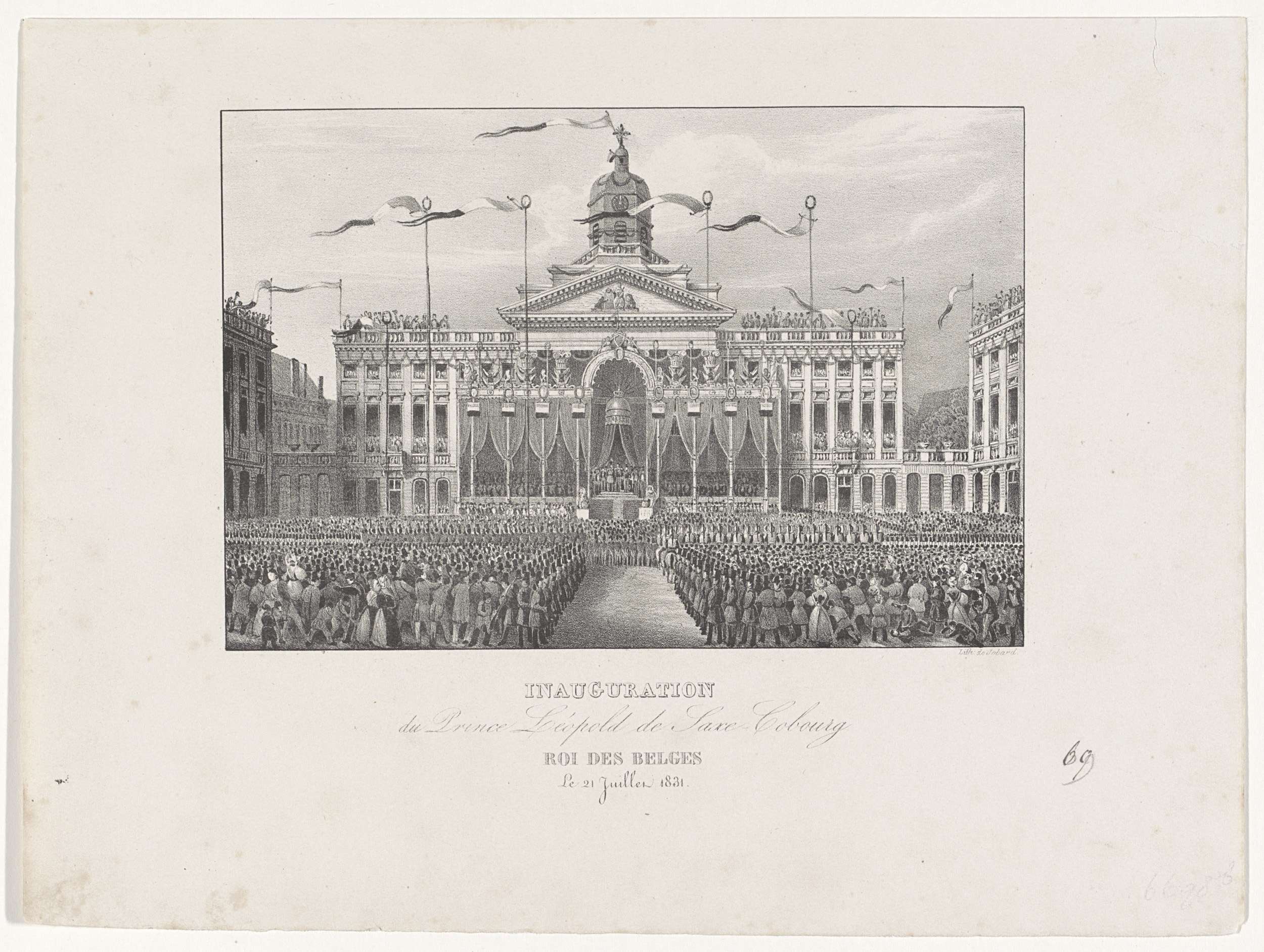 Plechtige inhuldiging van koning Leopold I in Brussel op 21 juli 1831. De koning met regeringsfunctionarissen en gasten op de estrade opgebouwd voor de kerk Sint-Jacob-op-Koudenberg aan het Koningsplein.