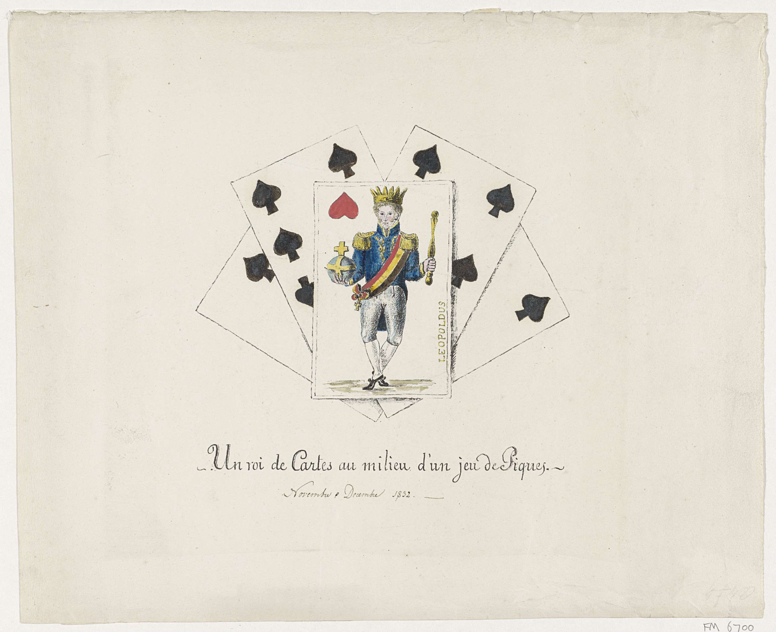 De Belgische koning Leopold I voorgesteld op een kaart als de hartenkoning tussen vier andere speelkaarten met schoppen, ca. 1831-1832.