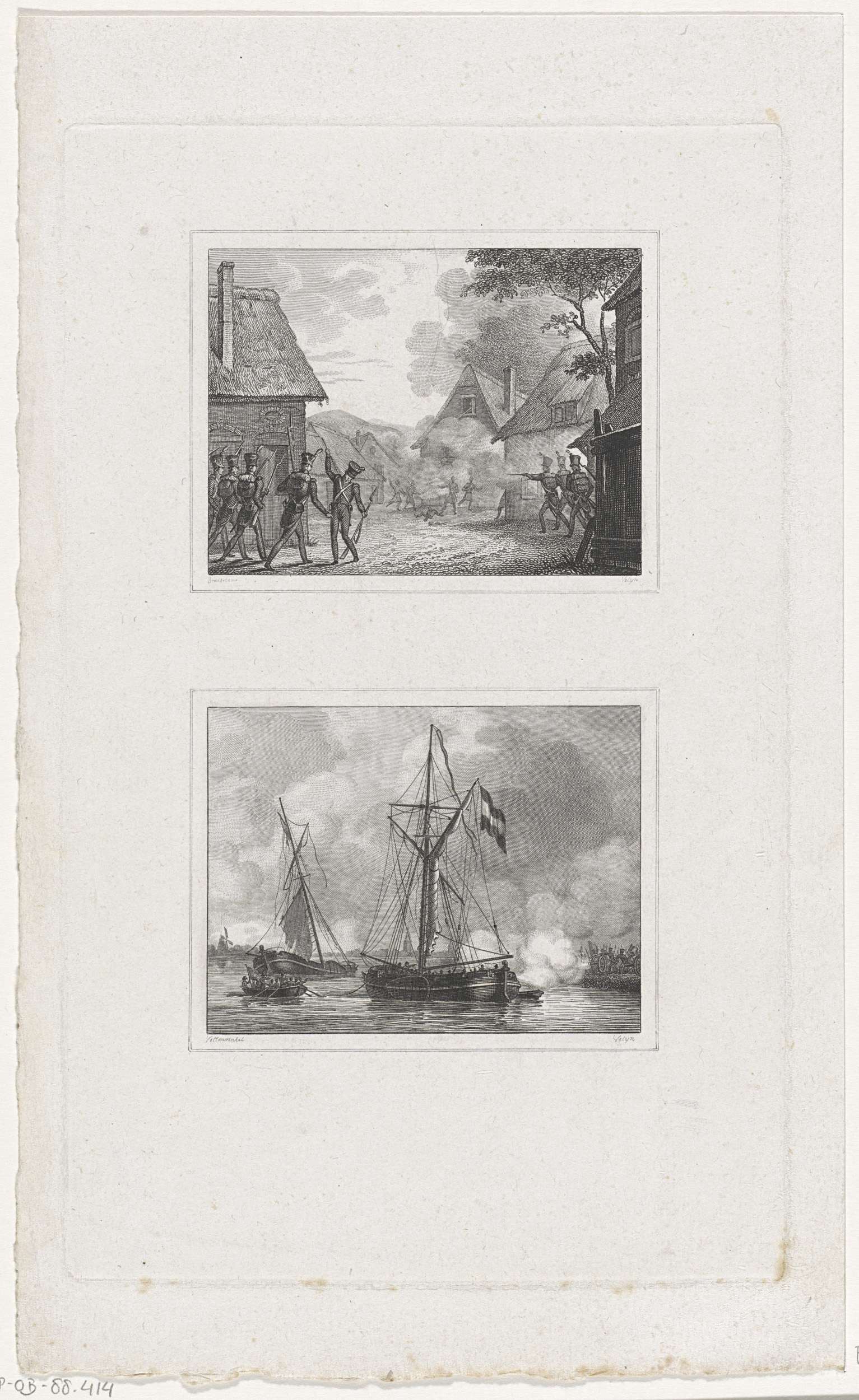 Blad met twee gebeurtenissen uit de Tiendaagse Veldtocht. Boven: de student Huët wordt bij schermutselingen te Oostham gedood. Onder: Gevecht bij het Hazegras (5 augustus). Onderdeel van een groep van 24 illustraties uit het boek van Olivier over de Tiendaagse Veldtocht, 2-12 augustus 1831.