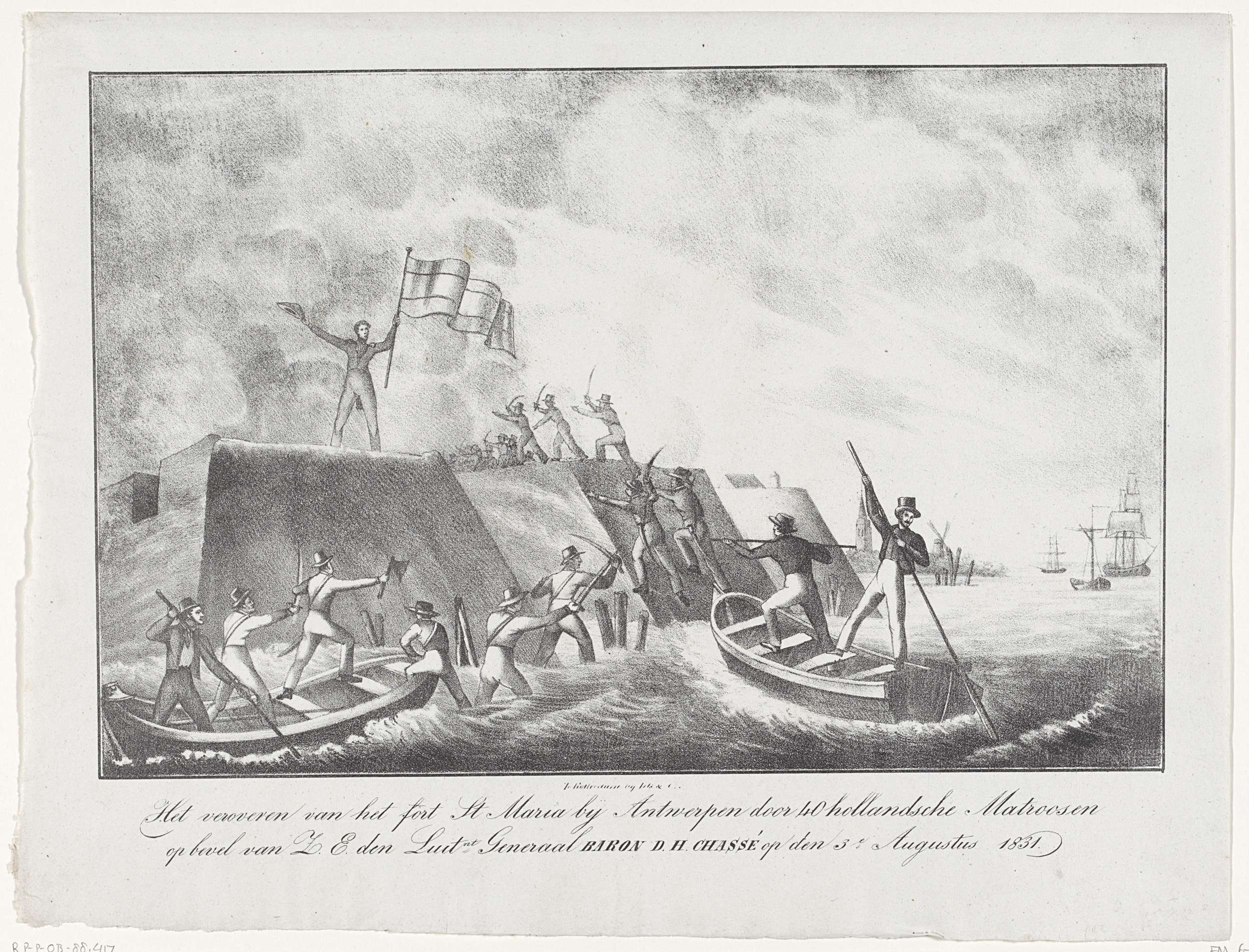 De verovering van het Belgische fort Sint-Marie aan de Schelde door veertig Nederlandse matrozen op bevel van luitenant-generaal Chassé, 3 augustus 1831. Onderdeel van een serie van drie platen.