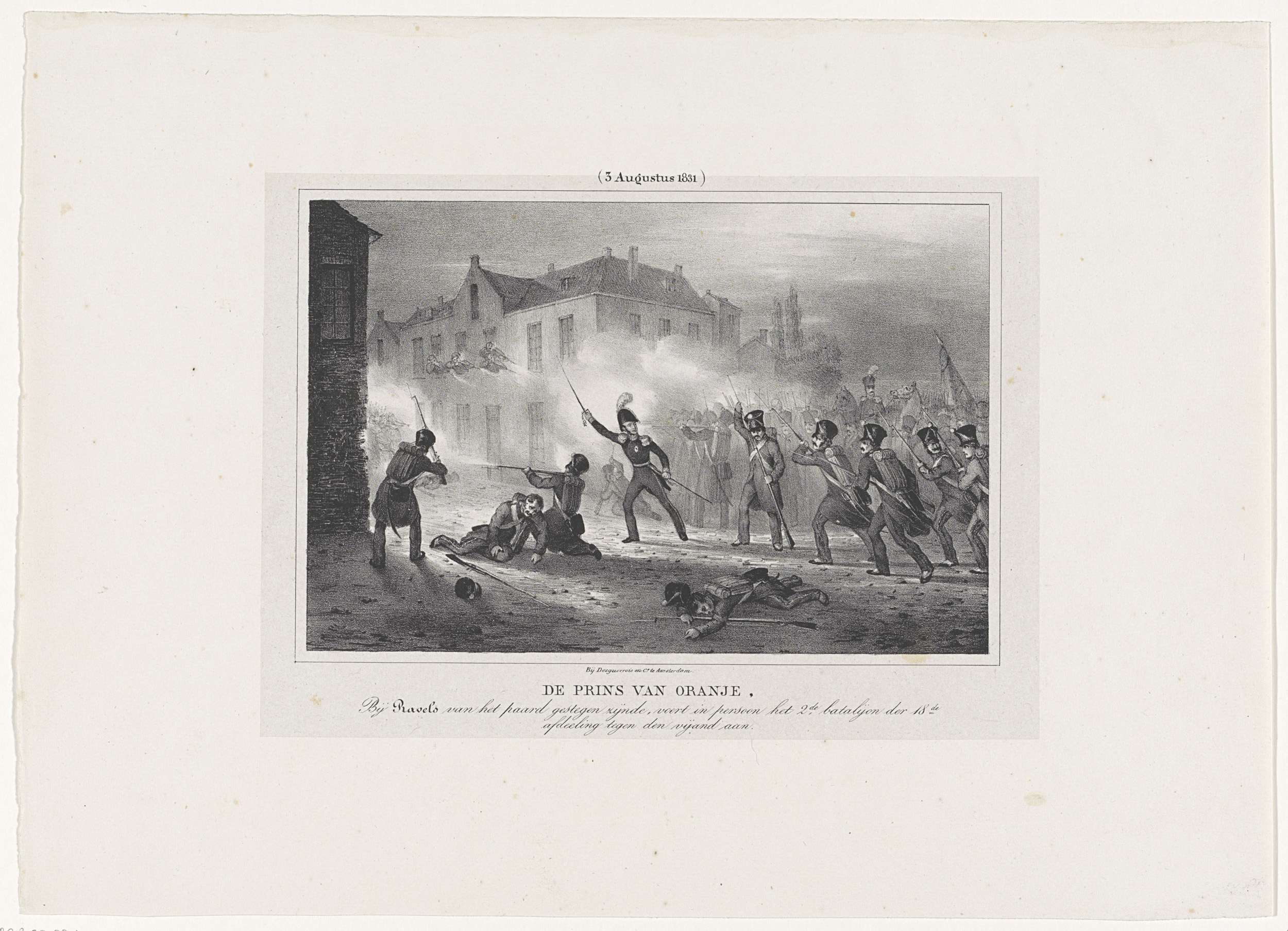 De Prins van Oranje leidt te voet het 2e bataljon van de 18e Afdeling Infanterie in de straten van Ravels, 3 augustus 1831. Onderdeel van een serie van zeven platen.