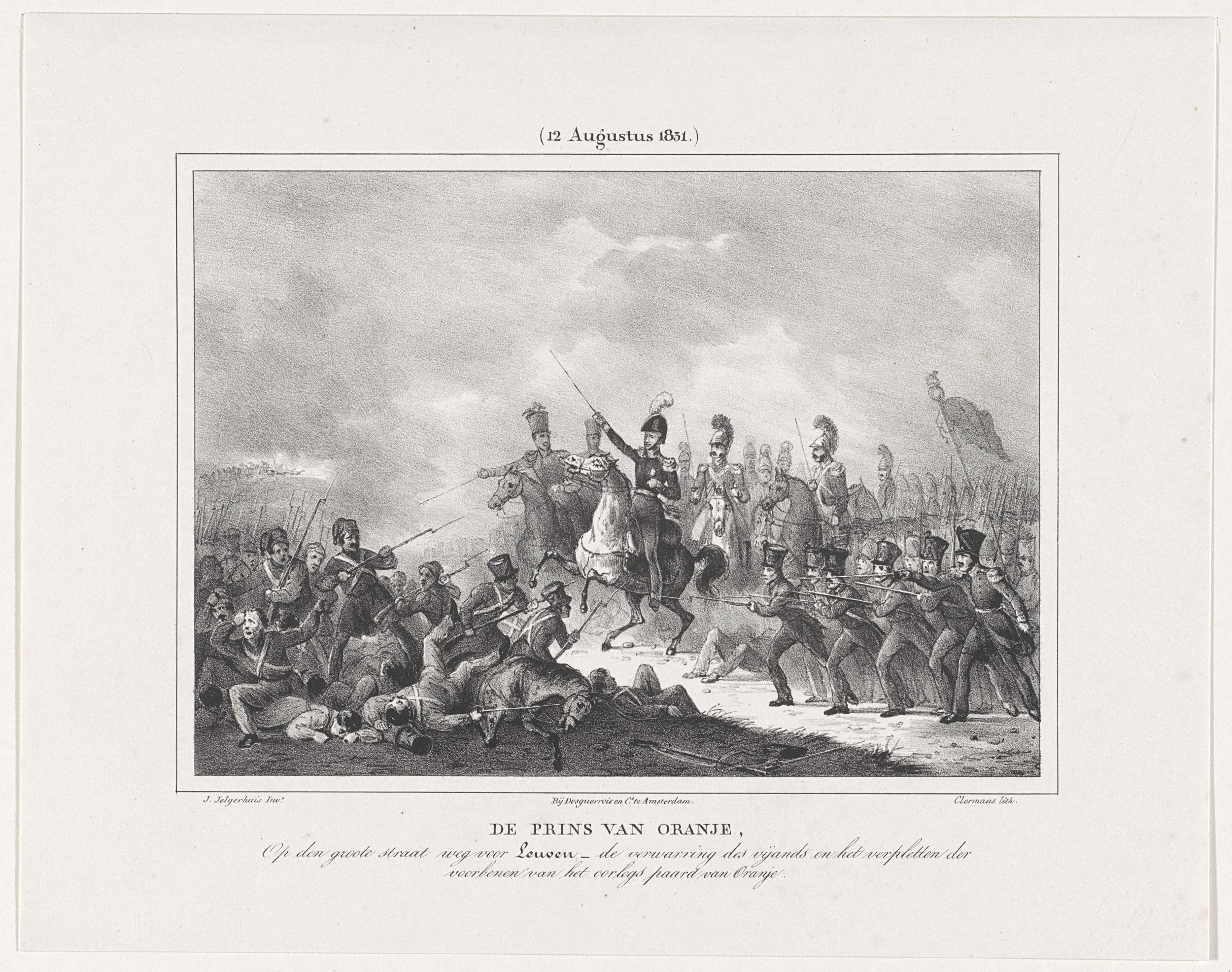 Het paard van de prins van Oranje raakt gewond tijdens de slag bij Leuven op 12 augustus 1831. Onderdeel van een serie van zeven platen.