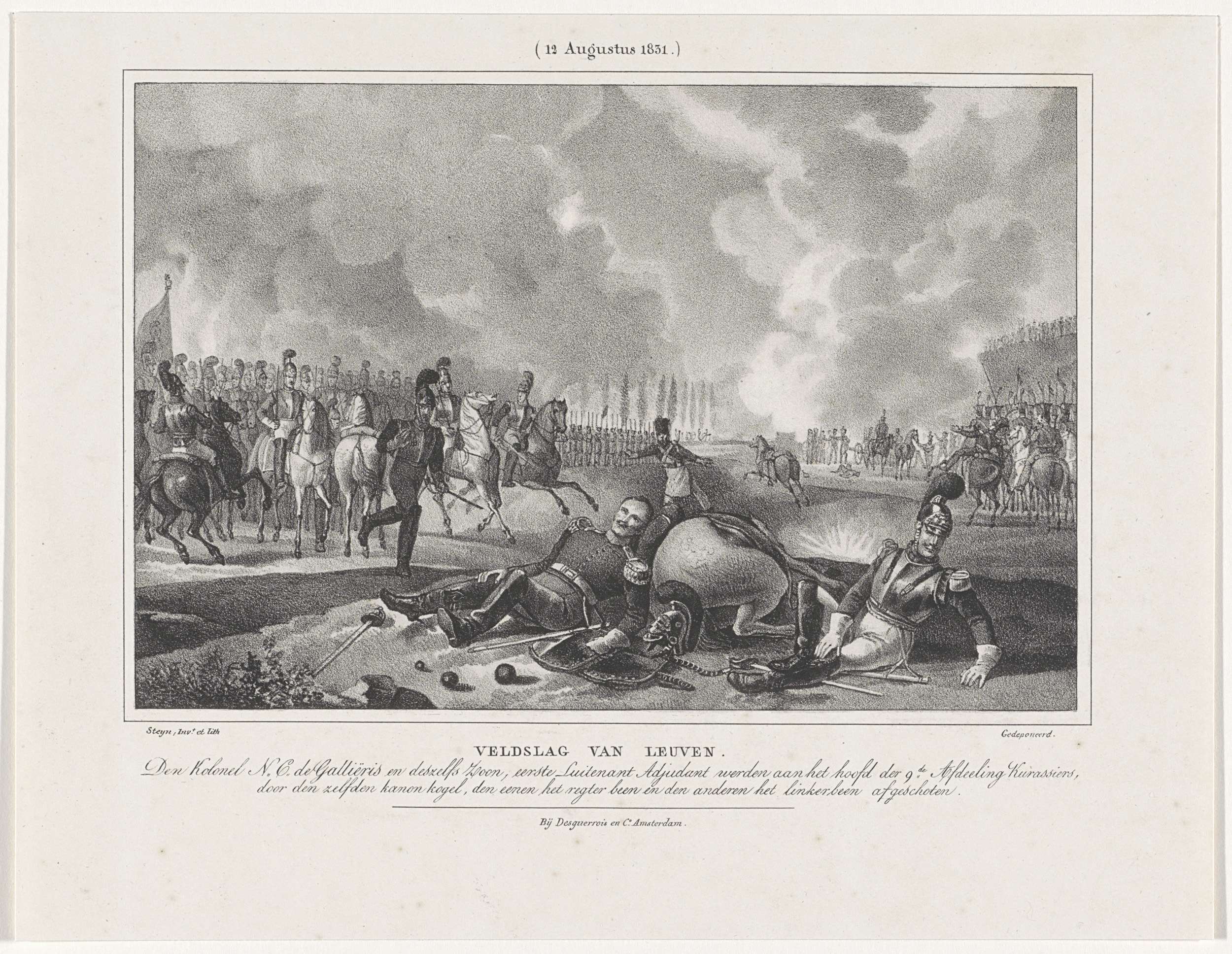 Tijdens de slag bij Leuven raken de kolonel N.C. de Gallières en zijn zoon, beiden van de 9e Afdeling Kurassiers, gewond, op 12 augustus 1831. Onderdeel van een serie van zeven platen.