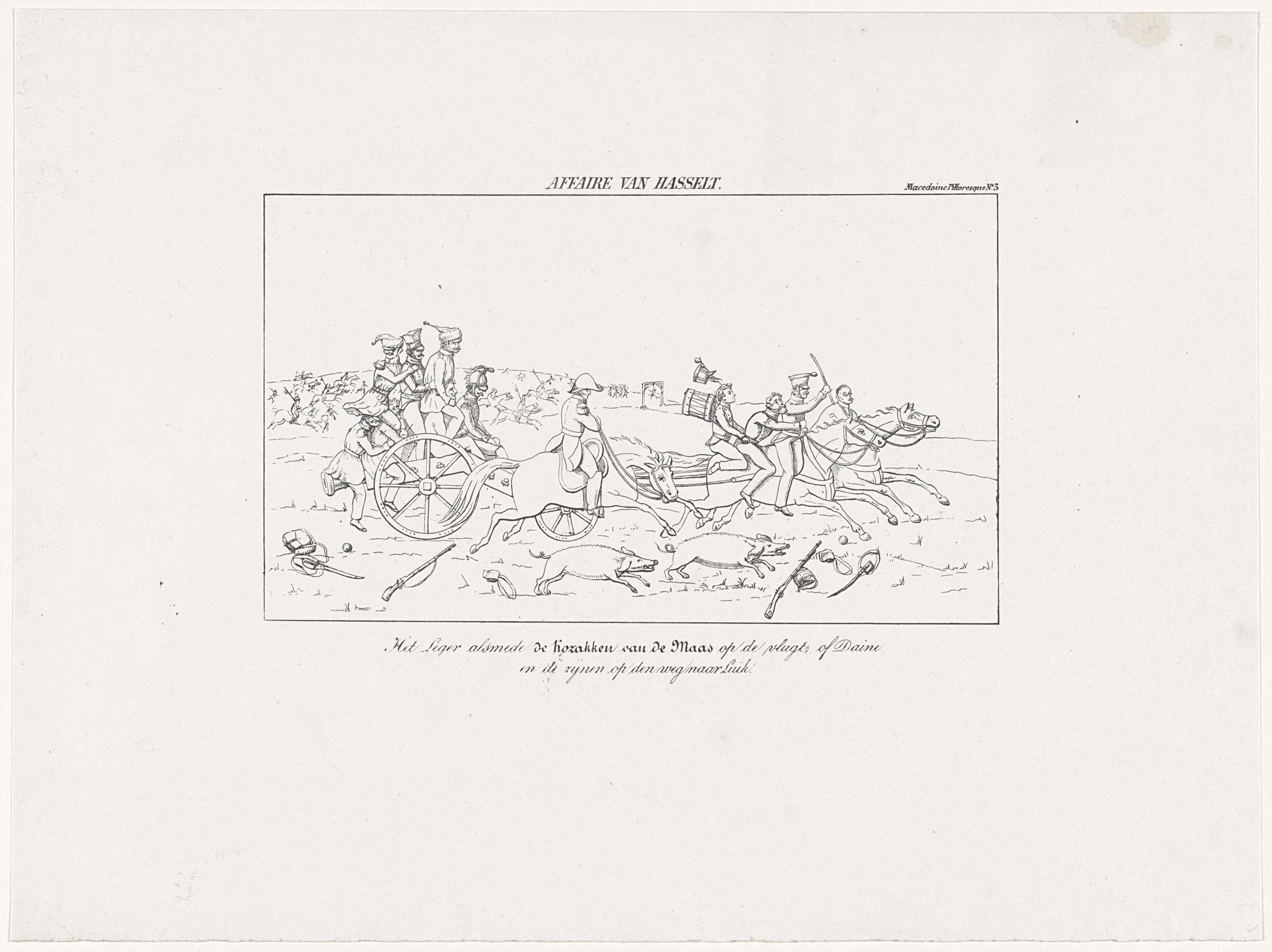 Spotprent op de vlucht van het Belgische leger na het verlies in de slag bij Hasselt op 8 augustus 1831. Generaal Daine slaat met zijn manschappen en twee varkens op de vlucht.