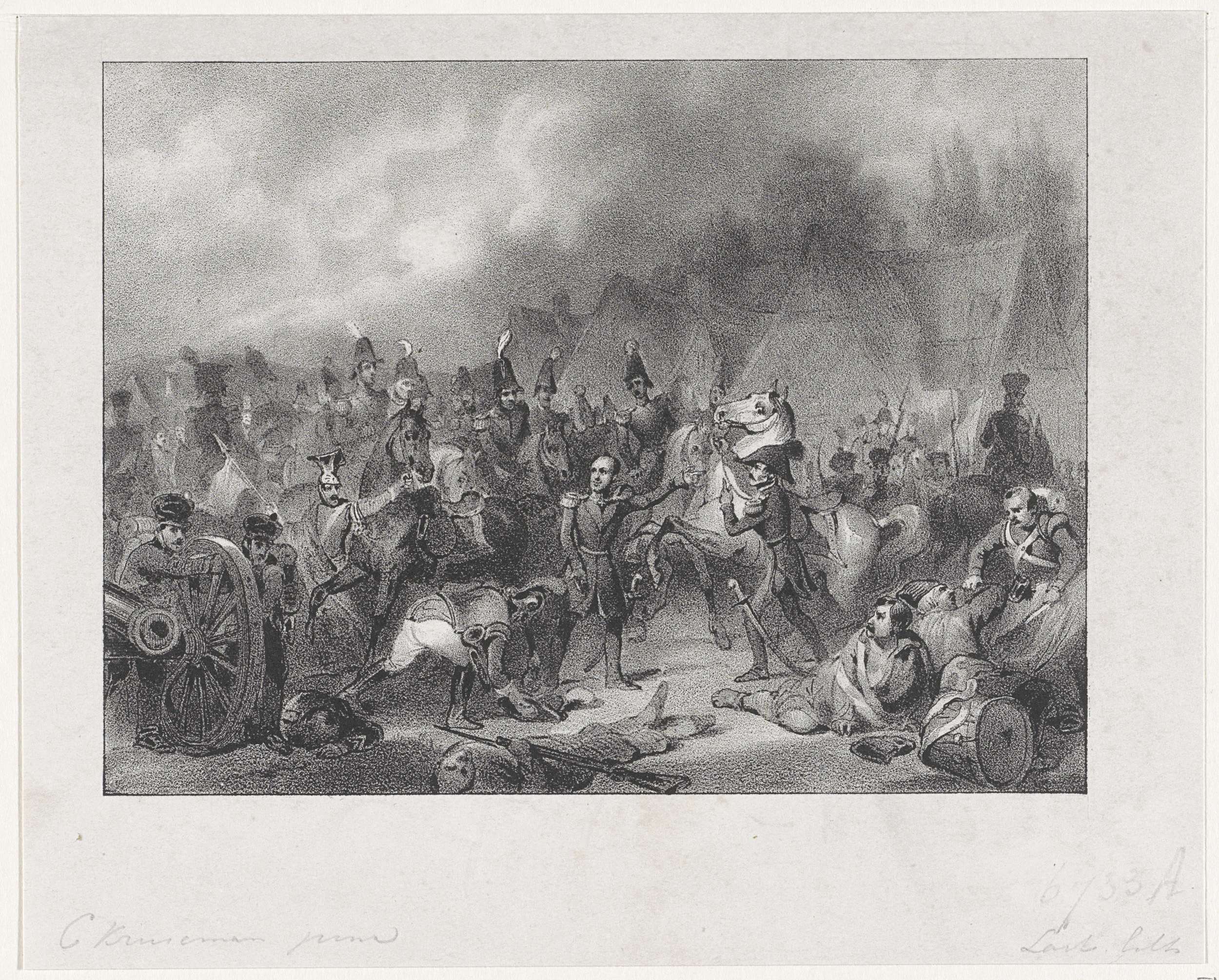 Overwinning in de slag bij Boutersem, 12 augustus 1831. Centraal staande op de grond de prins van Oranje die zijn paard waarvan een deel van been is afgeschoten verruilt voor een ander paard hem aangereikt door majoor Hoyel. Achter de prins zijn broer Frederik en zijn staf te paard. Links een kanon, op de voorgrond ...