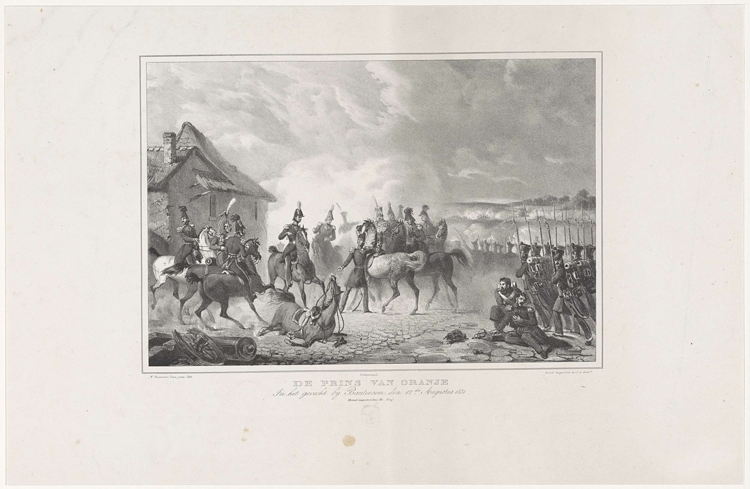 Overwinning in de slag bij Boutersem, 12 augustus 1831. Centraal staande op de grond de prins van Oranje die zijn paard waarvan een deel van been is afgeschoten verruilt voor een ander paard hem aangereikt door majoor Hoyel. Achter de prins zijn broer Frederik en zijn staf te paard. Rechts wordt een gewonde soldaat ondersteund. ...