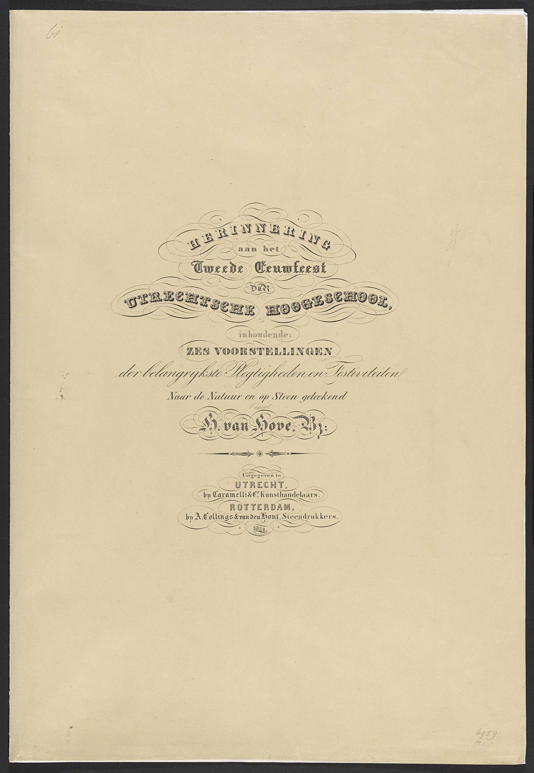 Omslag met een gedrukte verklaring, een titelplaat en zes ongenummerde platen van de feestelijkheden bij de viering van het tweede eeuwfeest (1636-1836) van de Utrechtsche Hogeschool, 12-17 juni 1836. Omslag met typografische titel.