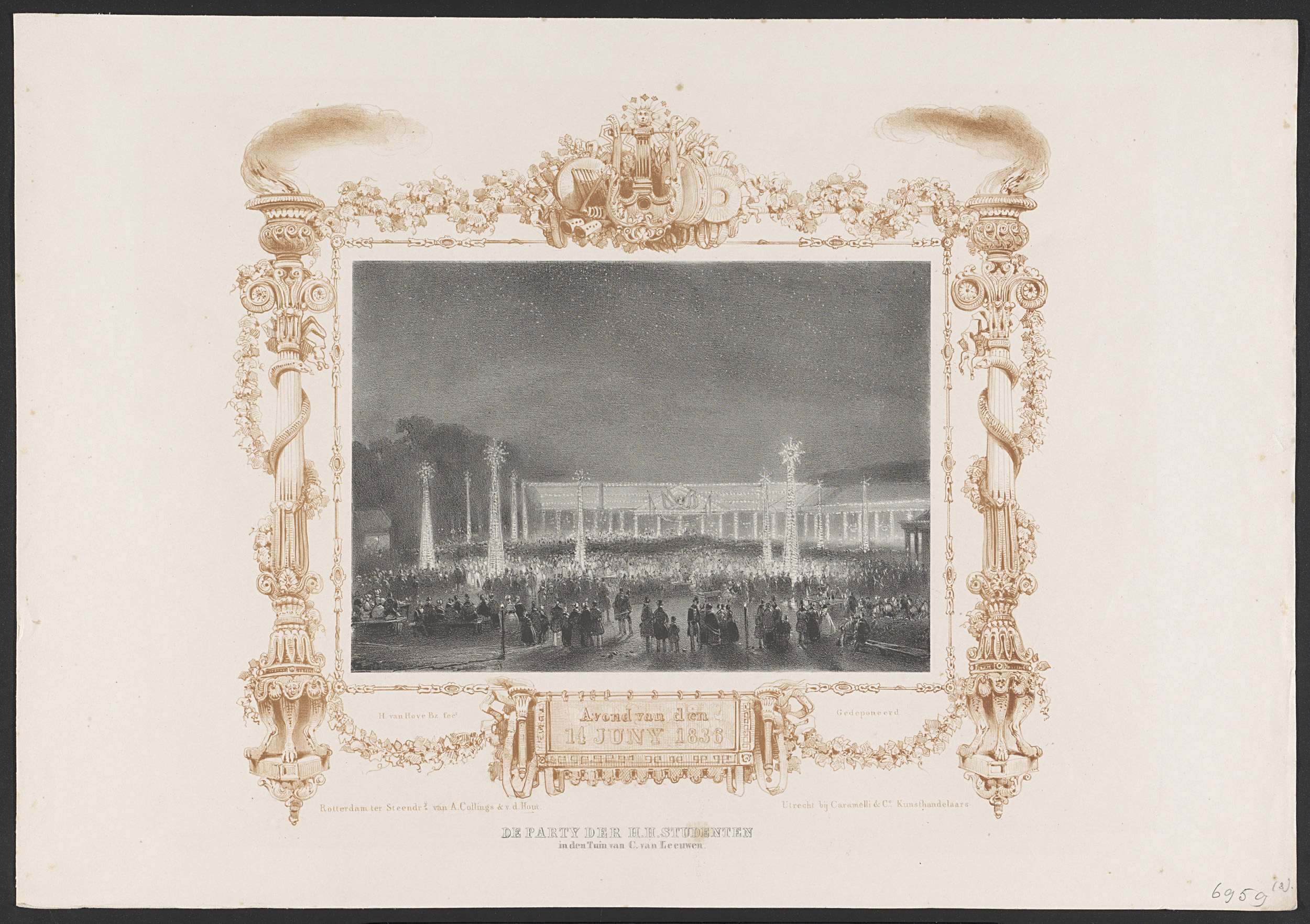 Groots feest voor de studenten van de Hogeschool, 's avonds gehouden in de verlichte tuin van Cornelis van Leeuwen, 14 juni 1836. Binnen een gekleurde ornamentele kader met zuilen met brandende vuurpotten. Onderdeel van de serie van zes ongenummerde platen van de feestelijkheden bij de viering van het tweede eeuwfeest (1636-1836) van de Utrechtsche Hogeschool, ...
