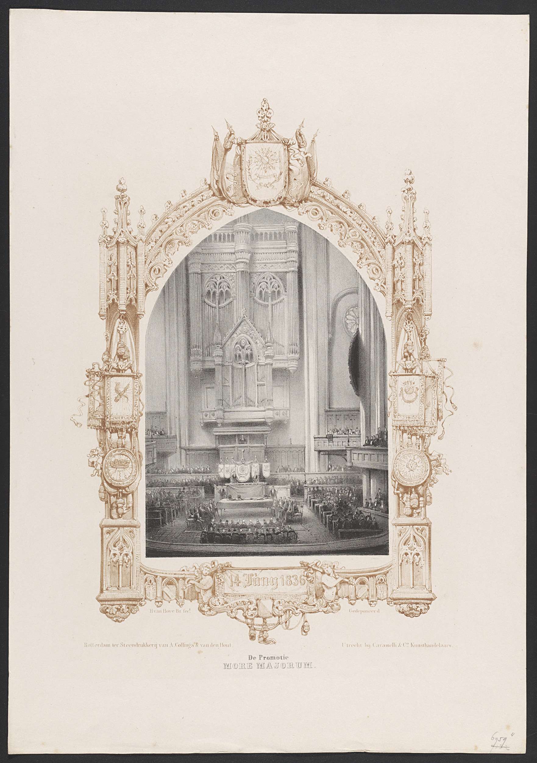 Gezicht in het interieur van de Domkerk waar een promotie 'more majorum', een publieke promotie, plaatsvindt, 14 juni 1836. Binnen een gekleurde decoratieve kader met kerkelijke ornamenten. Onderdeel van de serie van zes ongenummerde platen van de feestelijkheden bij de viering van het tweede eeuwfeest (1636-1836) van de Utrechtsche Hogeschool, 12-17 juni 1836.