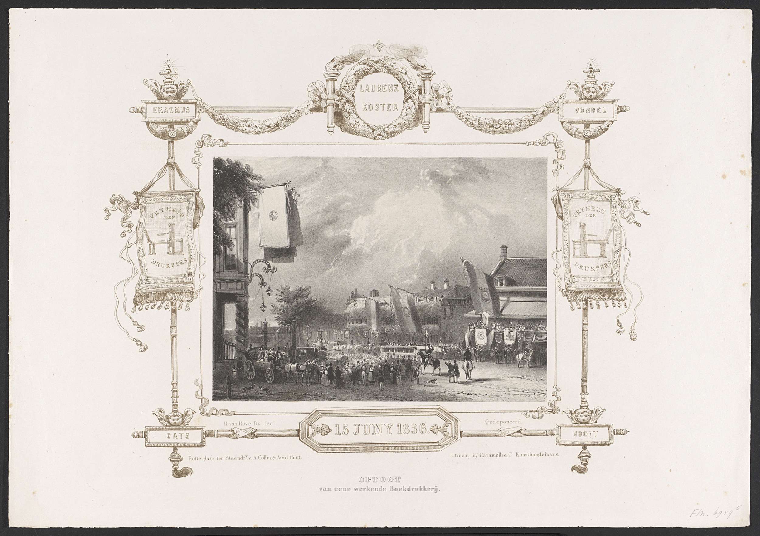 Aankomst en ontvangst op het Vredenburg van de optocht van boekdrukkers met een werkende boekdrukkerij, 15 juni 1836. Binnen een gekleurde decoratieve kader met vaandels met de vrijheid van drukpers en namen van belangrijke Nederlandse schrijvers. Onderdeel van de serie van zes ongenummerde platen van de feestelijkheden bij de viering van het tweede eeuwfeest (1636-1836) ...