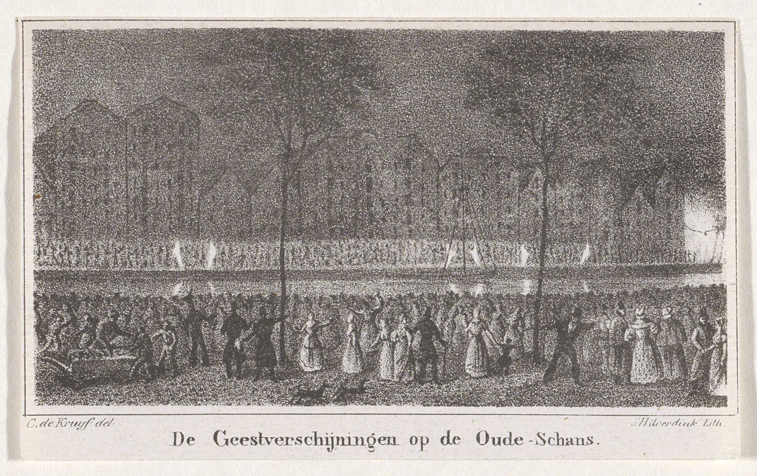 Verschijning van geesten op de Oudeschans te Amsterdam, in de avond van 8 en 9 oktober 1833. Langs de kade bewegen de spookachtige witte schimmen van vrouwen in lange gewaden. Op de voorgrond de verzamelde toeschouwers. De 'geesten' werden voortgebracht door enige studenten met behulp van toverlantaarnplaatjes.