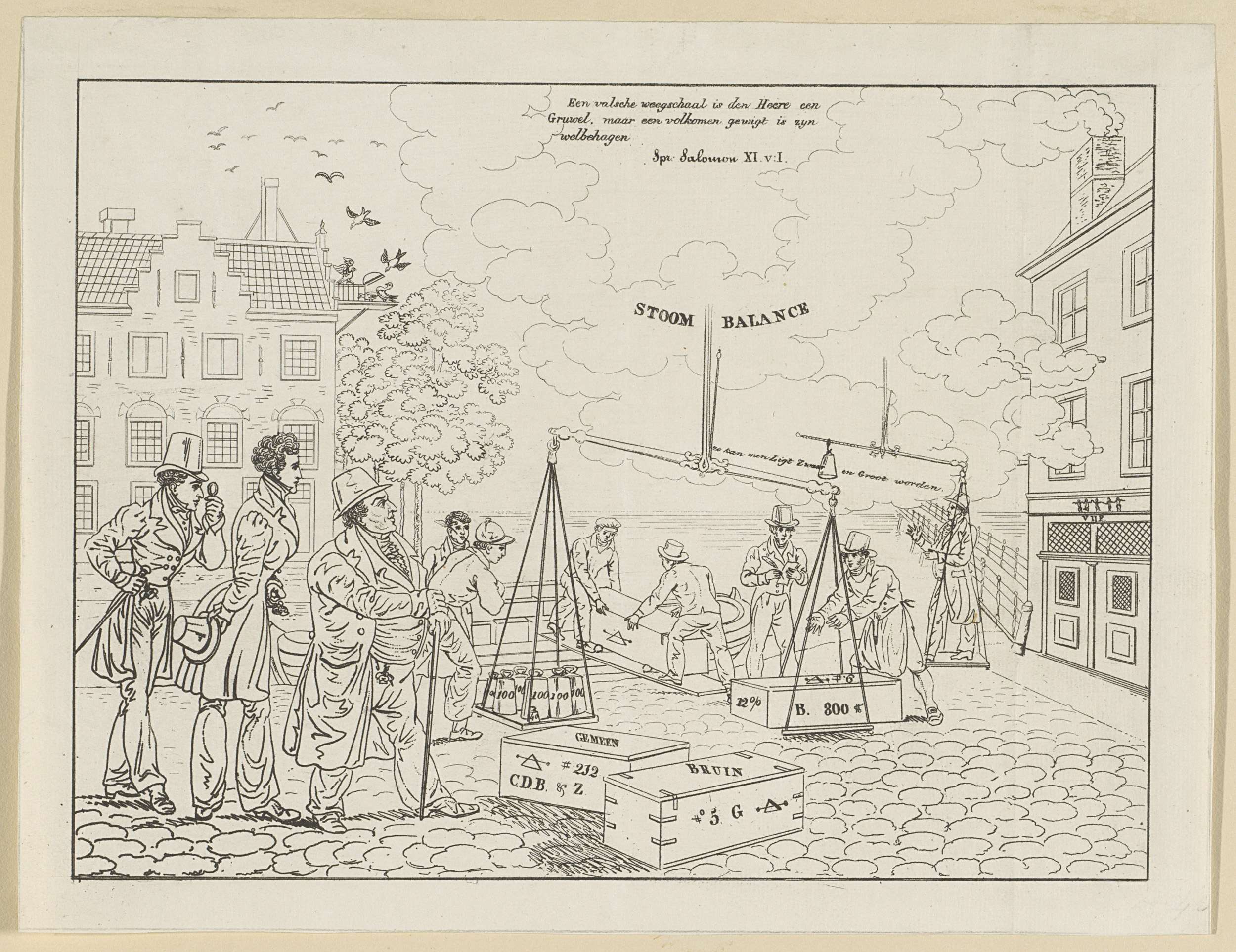 Spotprent op het bedrog met een valse weegschaal van de firma C. de Bruyn & Zonen, 1834. De firma bezat de eerste stoomsuikerraffinaderij aan de Lijnbaansgracht in Amsterdam. Op 8 januari 1834 werden zij betrapt op het gebruik van een balans waarvan een arm was verlengd. Centraal de valse balans hangend aan de stoomwolken die ...