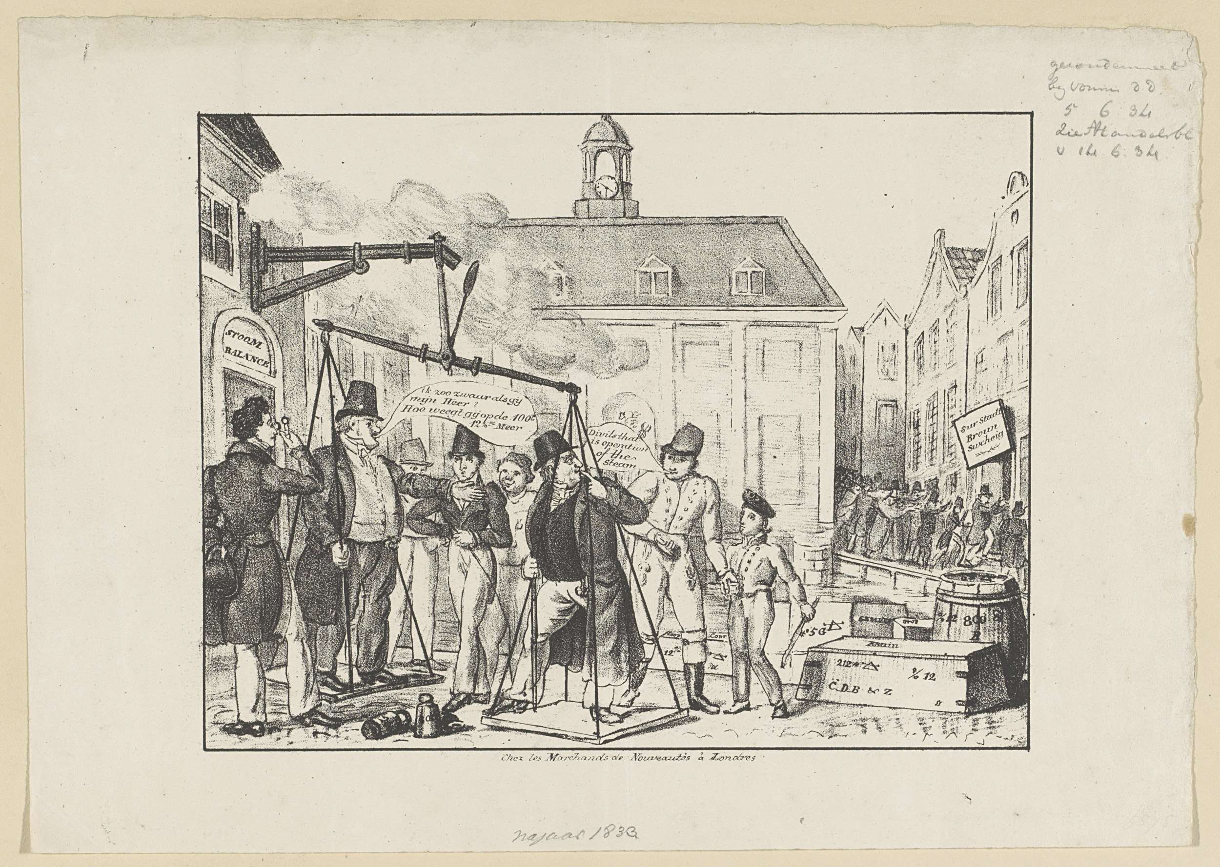 Spotprent op het bedrog met een valse weegschaal van de firma C. de Bruyn & Zonen, 1834. De firma bezat de eerste stoomsuikerraffinaderij aan de Lijnbaansgracht in Amsterdam. Op 8 januari 1834 werden zij betrapt op het gebruik van een balans waarvan een arm was verlengd. Links de valse balans hangend aan de gevel van ...