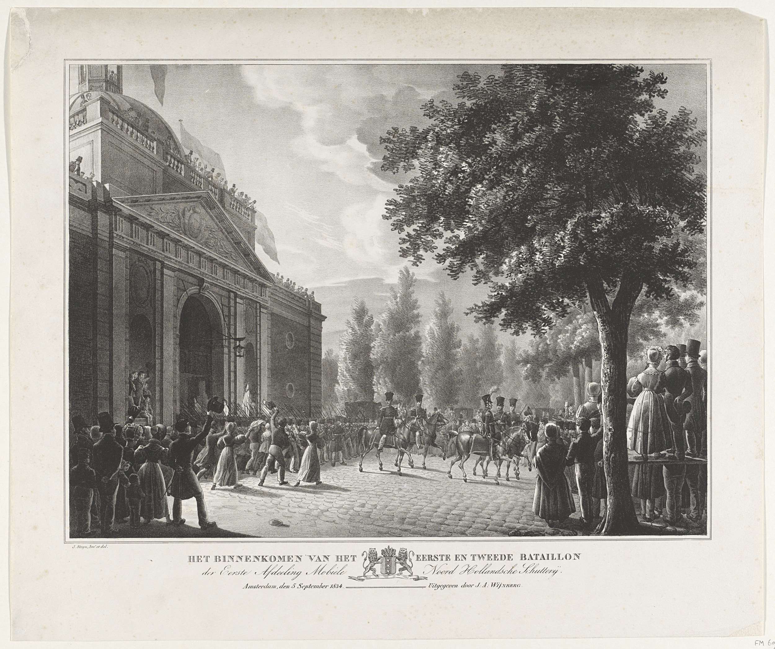Aankomst van het eerste en tweede bataljon van de eerste Afdeling Noordhollandse Schutterij door de Muiderpoort te Amsterdam op 5 september 1834. Op de poort en op de voorgrond links en rechts staan toeschouwers.