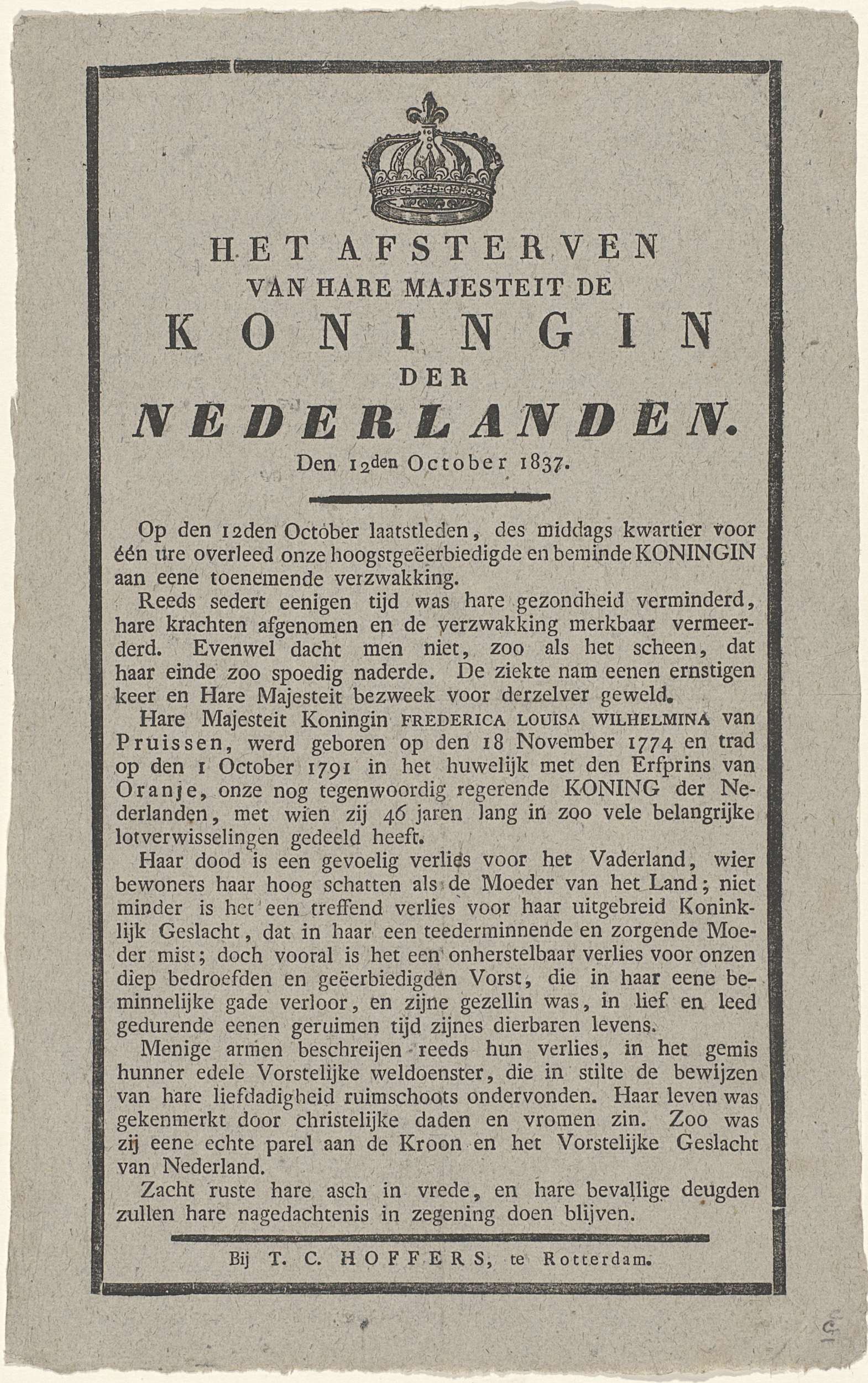 Het afsterven van hare majesteit de Koningin der Nederlanden. Den 12den October 1837