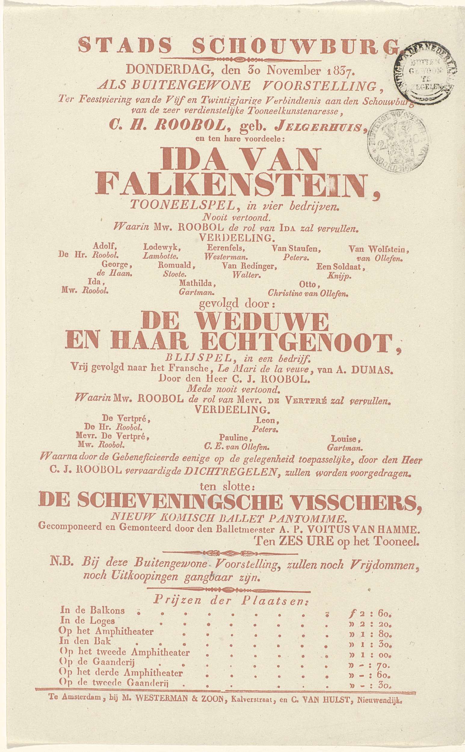 Aaanplakbiljet voor de toneelvoorstelling ter ere van de vijfentwintigjarige verbintenis van de actrice Catharina H. Roobol-Jelgerhuis bij de Amsterdamse Schouwburg, op 30 november 1837.