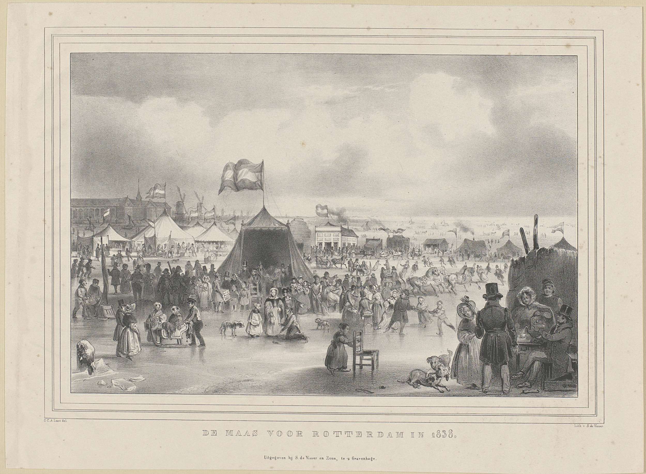 IJsprent op de bevroren Maas bij Rotterdam, januari 1838. Bij de prent behoort een afzonderlijke bericht van intekening.