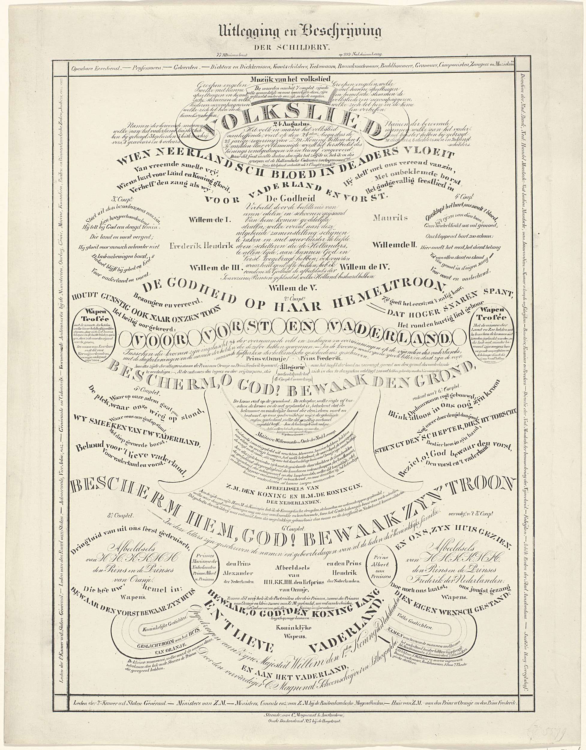 Verklaring van de kalligrafische voorstelling op het vijfentwintigjarige regeringsjubileum van koning Willem I in november 1838 met de coupletten van het lied 'Wien Neêrlands Bloed in de Aders vloeit' uitgevoerd in kalligrafie.