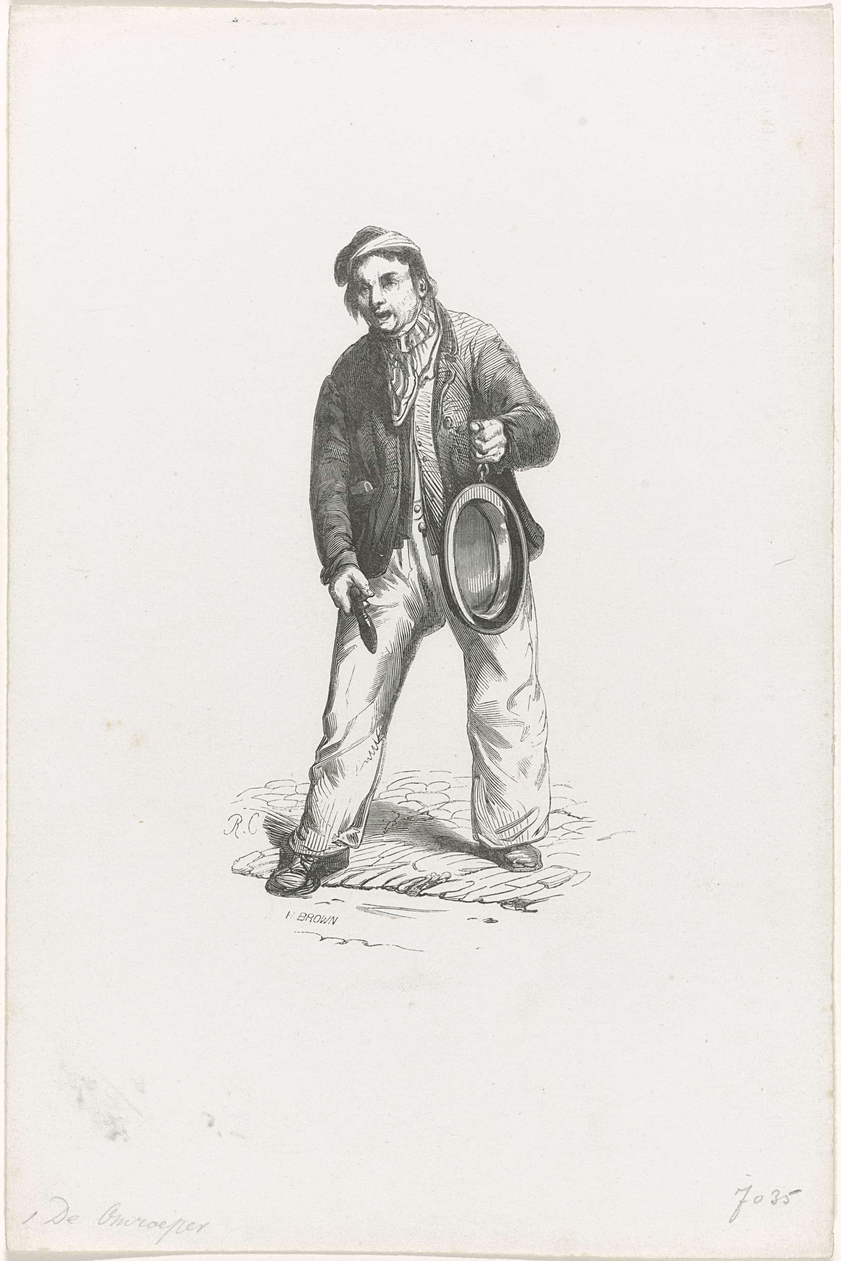 Staande omroeper met bekken en stok om er mee op te slaan. Los exemplaar van een illustratie uit:een boek met karakterschetsen, beroepen en klederdrachten van Nederlandse volkstypen uit 1841. Ongenummerd.