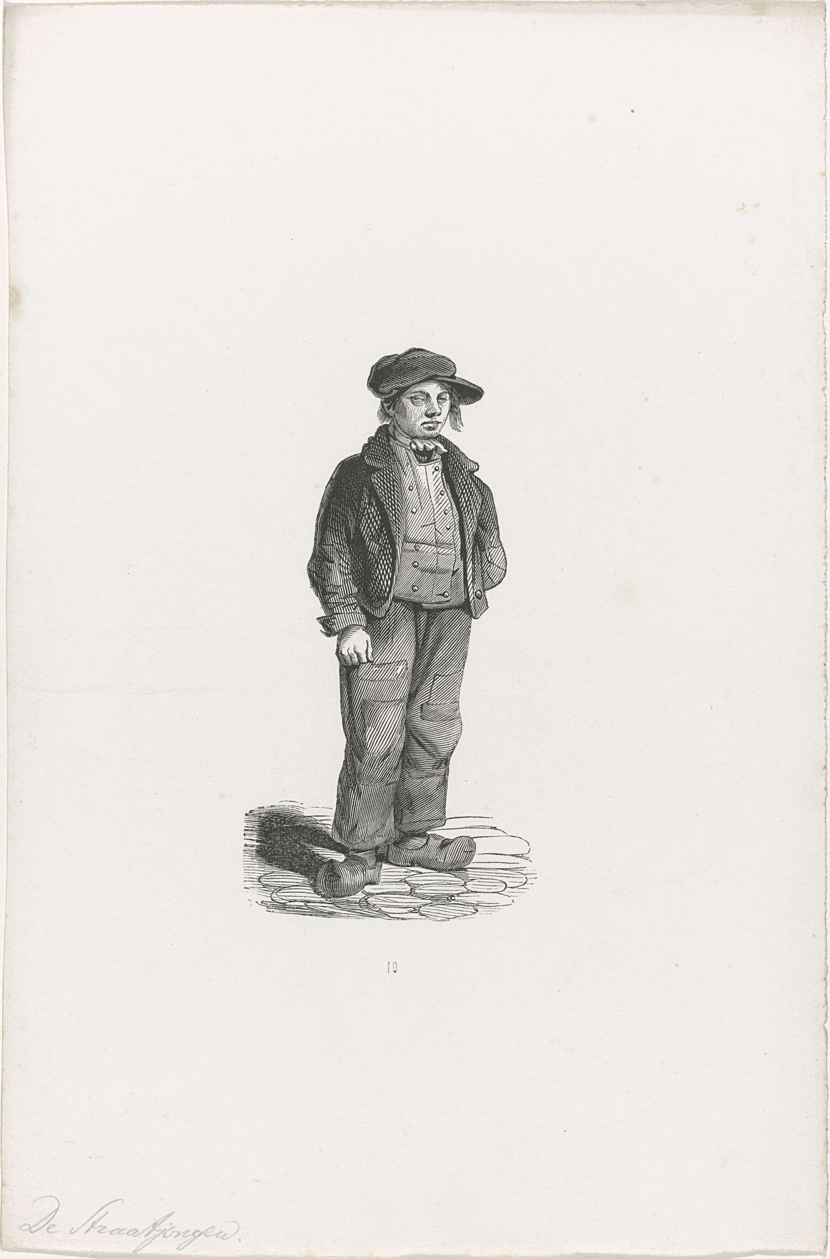 De straatjongen. Staande jonge man. Los exemplaar van een illustratie uit:een boek met karakterschetsen, beroepen en klederdrachten van Nederlandse volkstypen uit 1841. Genummerd: 10.