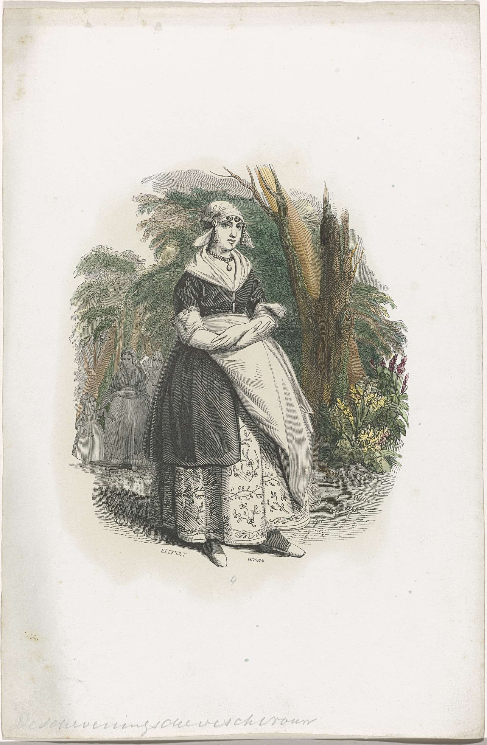 Een staande jonge vrouw, visverkoopster uit Scheveningen. Los exemplaar van een illustratie uit:een boek met karakterschetsen, beroepen en klederdrachten van Nederlandse volkstypen uit 1841. Ongenummerd.
