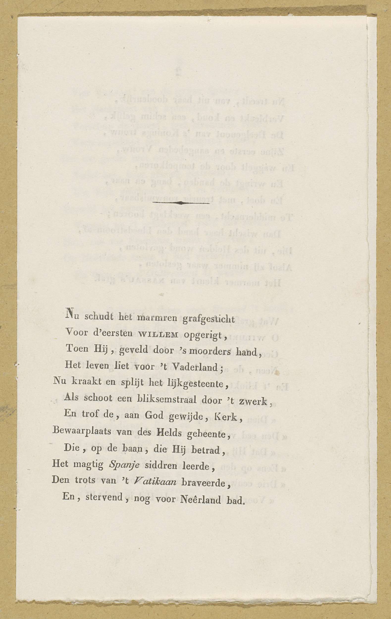 Gedrukt schimpdicht op het voorgenomen huwelijk van de voormalige koning Willem I met de katholieke H.R. rijksgravin Henriëtte d'Oultremont de Wégimont, 1840. Dubbelgevouwen blad bedrukt op alle vier (genummerde) bladzijden.