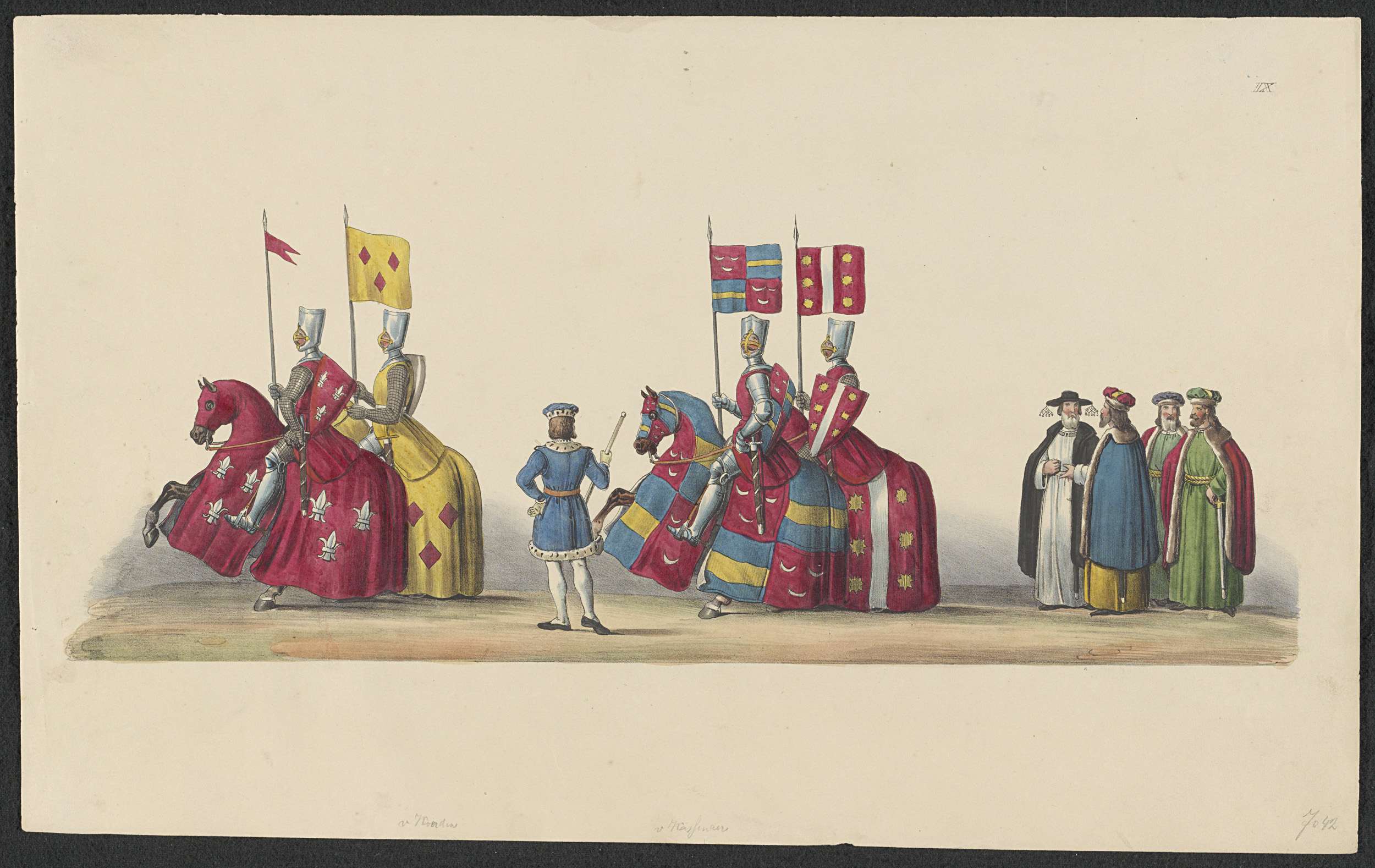 Vier ridders in wapenrusting te paard, gevolgd door een groep (Oosterse?) mannen in lange mantels. Blad genummerd IX in de serie van achttien platen van de historische gekostumeerde optocht voorstellende de ontvangst van graaf Willem II van Holland in Utrecht in 1249. De optocht gehouden door de studenten van de Universiteit van Utrecht op 2 ...