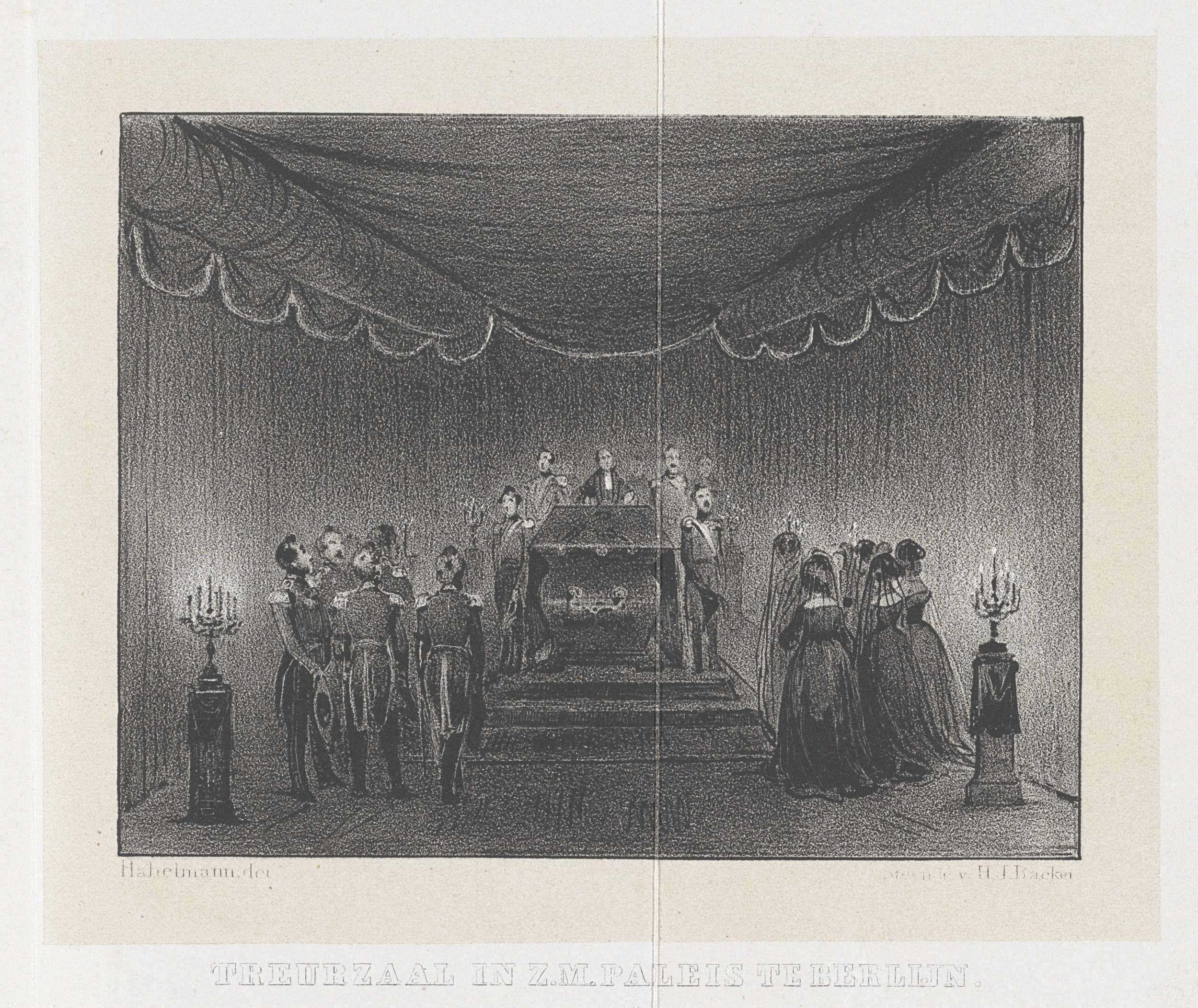 Treurzaal met de lijkkist van de voormalige koning Willem I in het Altes Palais aan de Unter den Linden te Berlijn, op het moment dat de lijkrede wordt uitgesproken, 22 december 1843. In de beschrijving een lijst van de zestien personen aanwezig, waaronder de koning van Pruisen. Eerste plaat in het boekje met twee platen ...