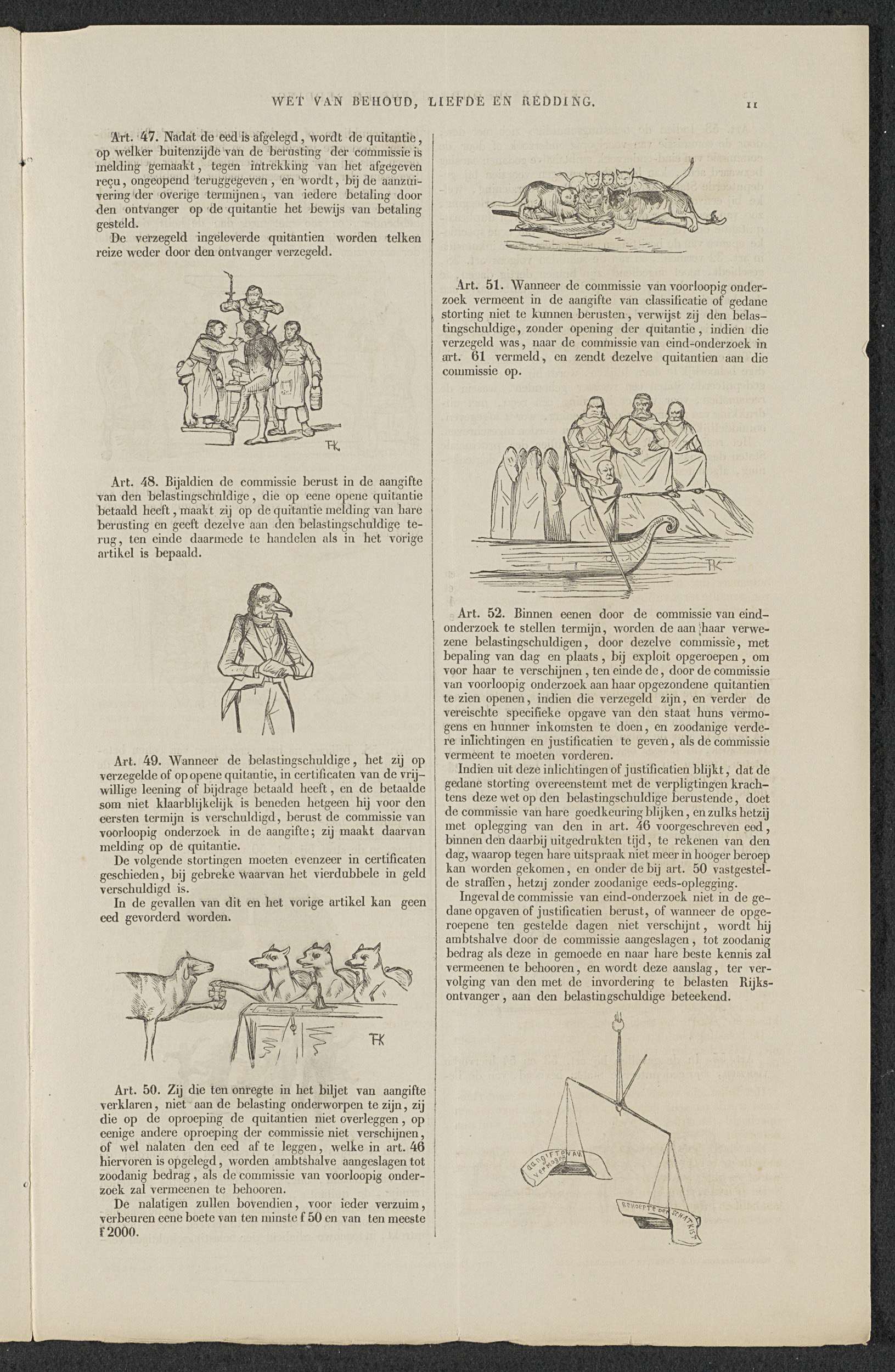 Bladzijde 11 met artikels 47-52 van de 'Wet van Behoud, Liefde en Redding'. Een satire in zestien bladzijden op de aansporing tot deelneming in de (zogenaamde) vrijwillige 3% geldlening uitgeschreven in maart 1844 door minister F.A. van Hall. Binnenzijde van een dubbelgevouwen blad bedrukt op alle zijden.