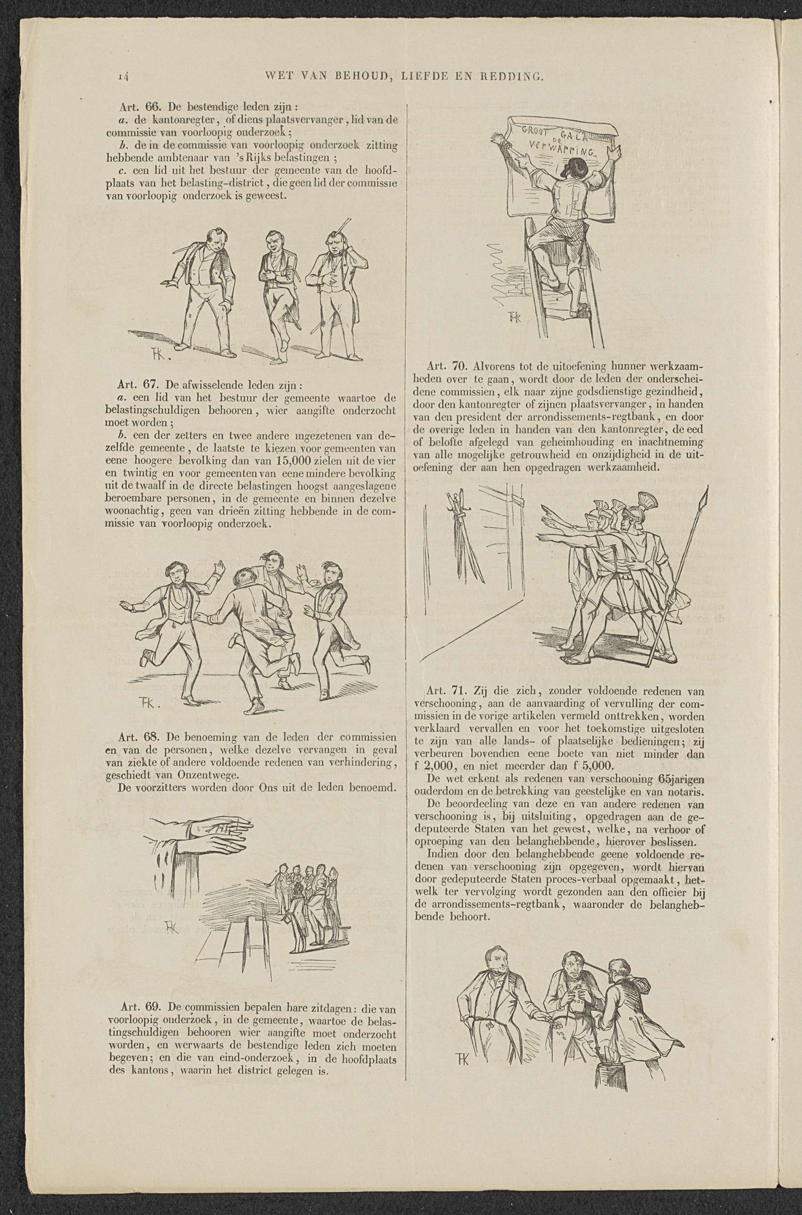 Bladzijde 14 met artikels 66-71 van de 'Wet van Behoud, Liefde en Redding'. Een satire in zestien bladzijden op de aansporing tot deelneming in de (zogenaamde) vrijwillige 3% geldlening uitgeschreven in maart 1844 door minister F.A. van Hall. Binnenzijde van een dubbelgevouwen blad bedrukt op alle zijden.