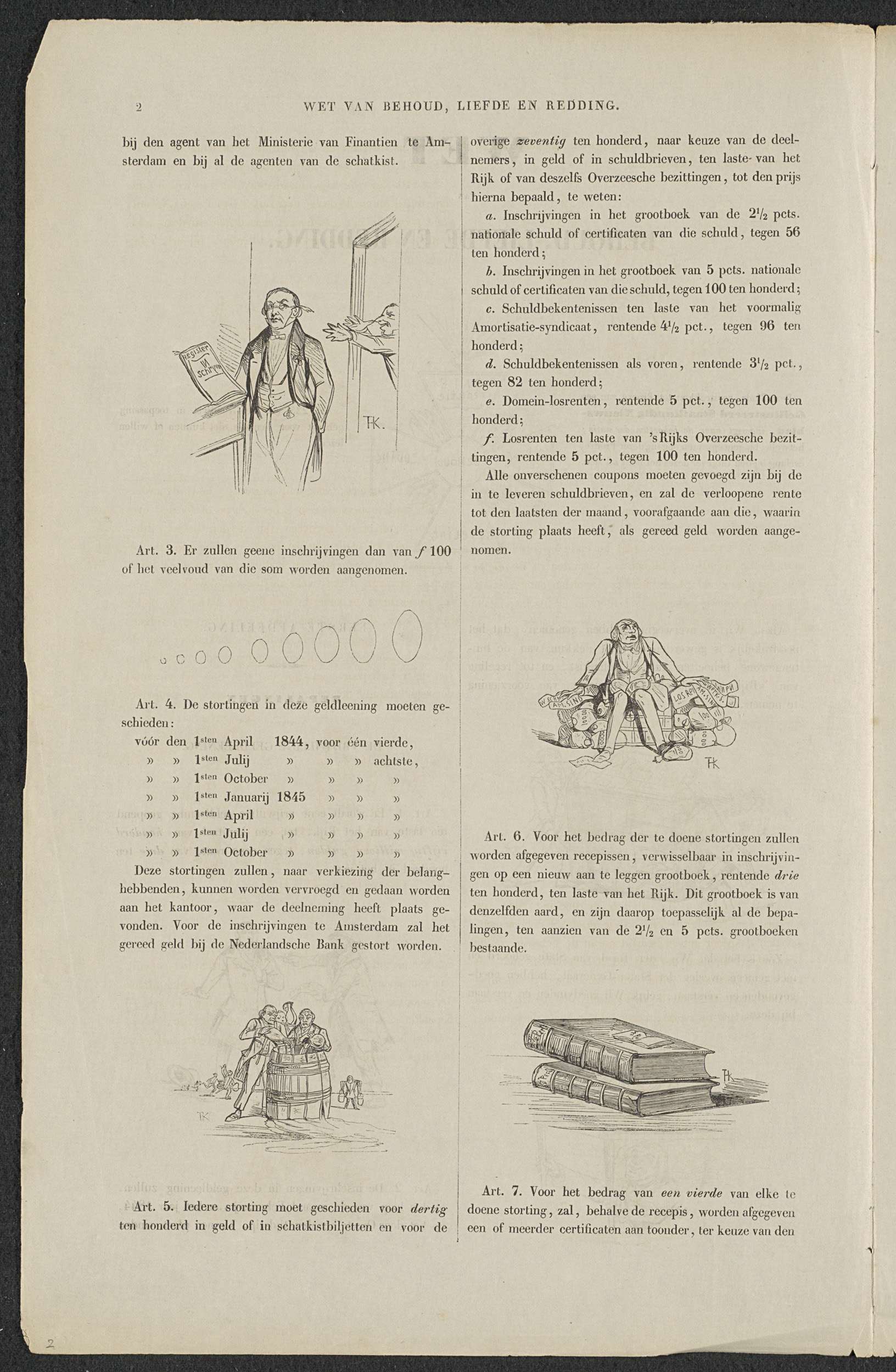 Bladzijde 2 met artikels 3-7 van de 'Wet van Behoud, Liefde en Redding'. Een satire in zestien bladzijden op de aansporing tot deelneming in de (zogenaamde) vrijwillige 3% geldlening uitgeschreven in maart 1844 door minister F. A. van Hall. Binnenzijde van een dubbelgevouwen blad bedrukt op alle zijden.