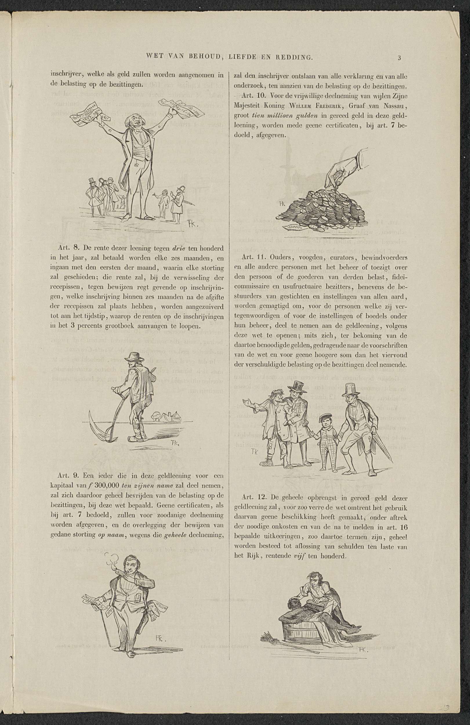 Bladzijde 3 met artikels 8-12 van de 'Wet van Behoud, Liefde en Redding'. Een satire in zestien bladzijden op de aansporing tot deelneming in de (zogenaamde) vrijwillige 3% geldlening uitgeschreven in maart 1844 door minister F. A. van Hall. Binnenzijde van een dubbelgevouwen blad bedrukt op alle zijden.