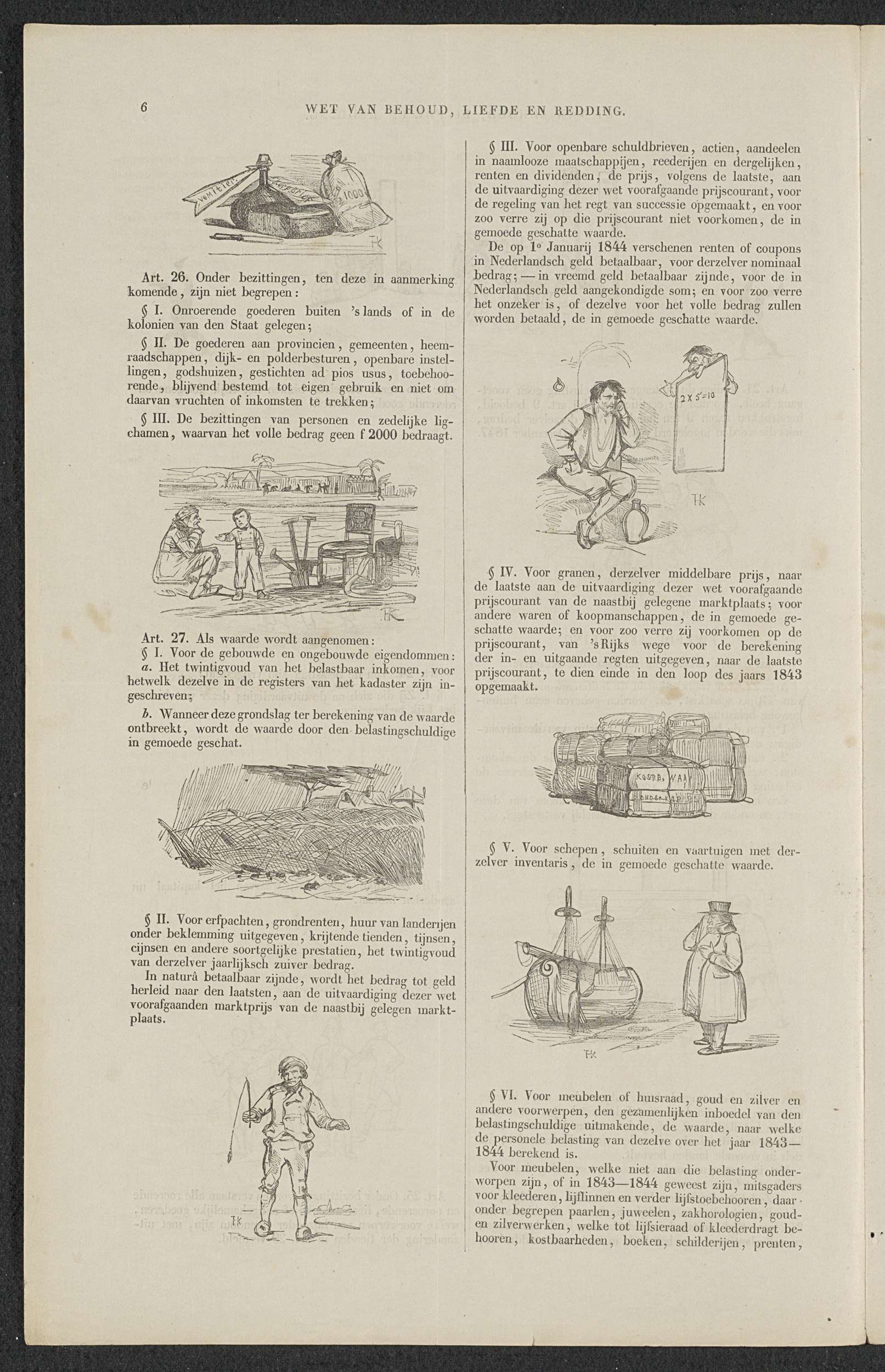Bladzijde 6 met artikels 26-27 van de 'Wet van Behoud, Liefde en Redding'. Een satire in zestien bladzijden op de aansporing tot deelneming in de (zogenaamde) vrijwillige 3% geldlening uitgeschreven in maart 1844 door minister F.A. van Hall. Binnenzijde van een dubbelgevouwen blad bedrukt op alle zijden.