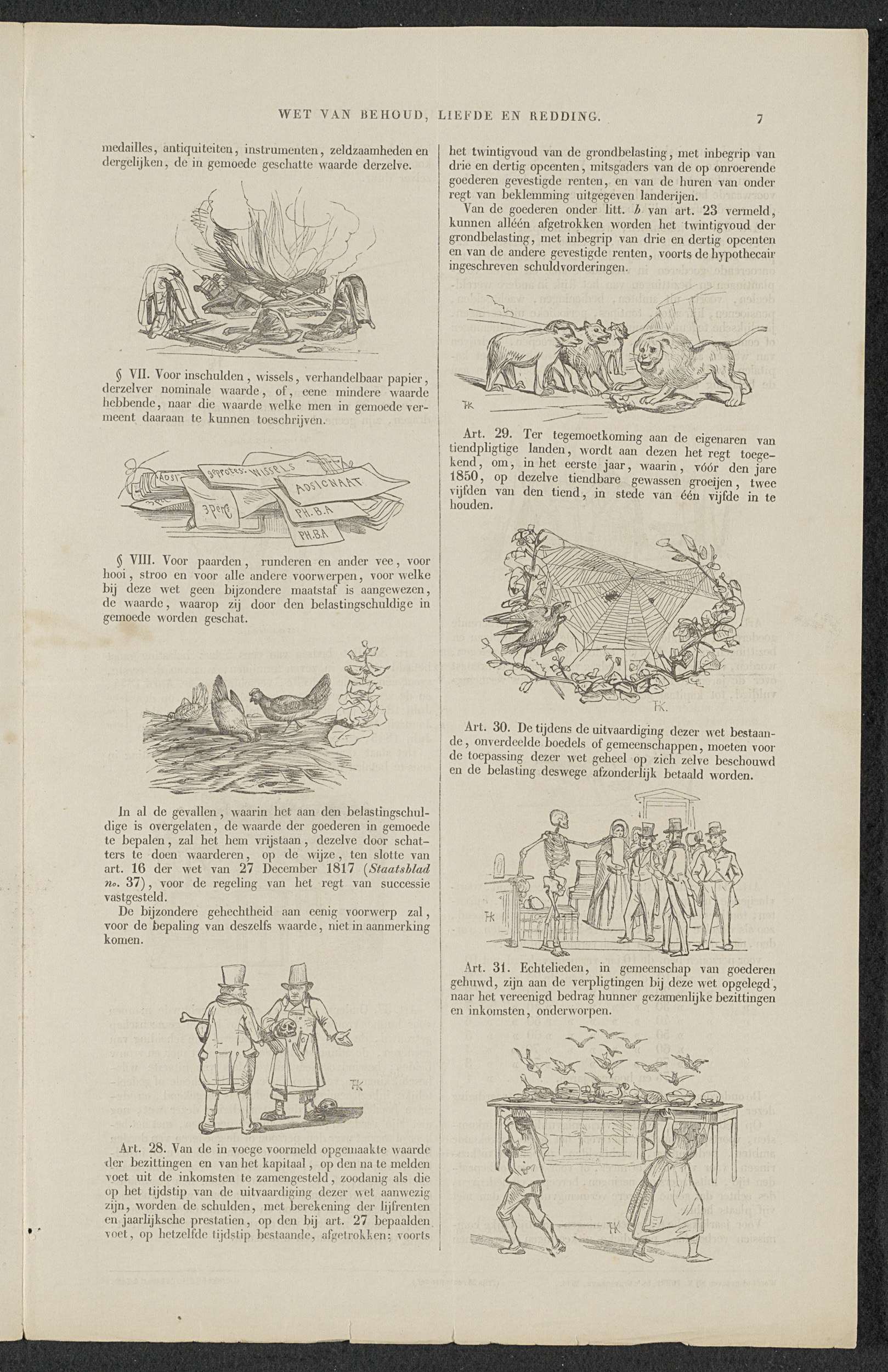 Bladzijde 7 met artikels 28-31 van de 'Wet van Behoud, Liefde en Redding'. Een satire in zestien bladzijden op de aansporing tot deelneming in de (zogenaamde) vrijwillige 3% geldlening uitgeschreven in maart 1844 door minister F.A. van Hall. Binnenzijde van een dubbelgevouwen blad bedrukt op alle zijden.