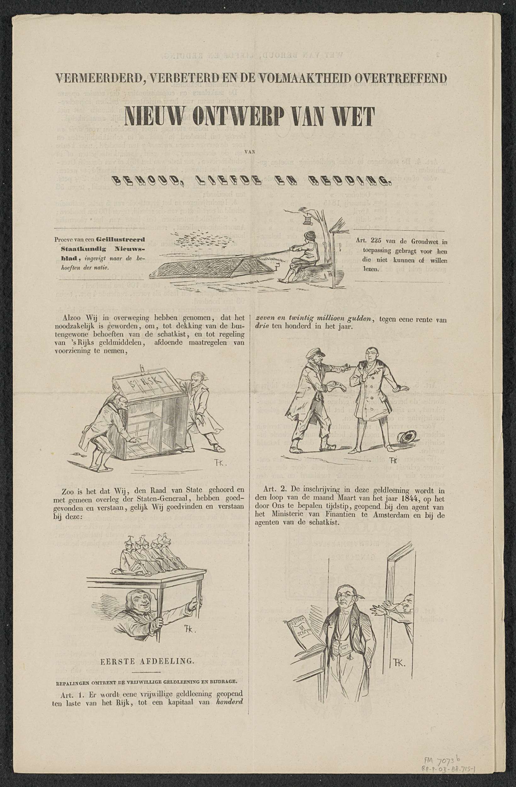 Herdruk van de satire op de aansporing tot deelneming in de (zogenaamde) vrijwillige 3% geldlening van 1844 (blad 1)