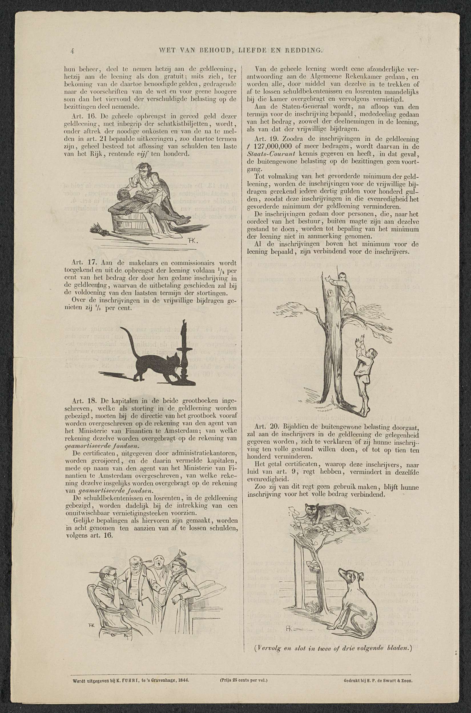Bladzijde 4 met artikels 16-20 van het 'Vermeerderd, Verbeterd en de Volmaaktheid Overtreffend Nieuw Ontwerp van Wet van Behoud, Liefde en Redding'. Een enigszins aaangepaste herdruk van satire in zestien bladzijden op de aansporing tot deelneming in de (zogenaamde) vrijwillige 3% geldlening uitgeschreven in maart 1844 door minister F.A. van Hall. Achterzijde van een dubbelgevouwen ...