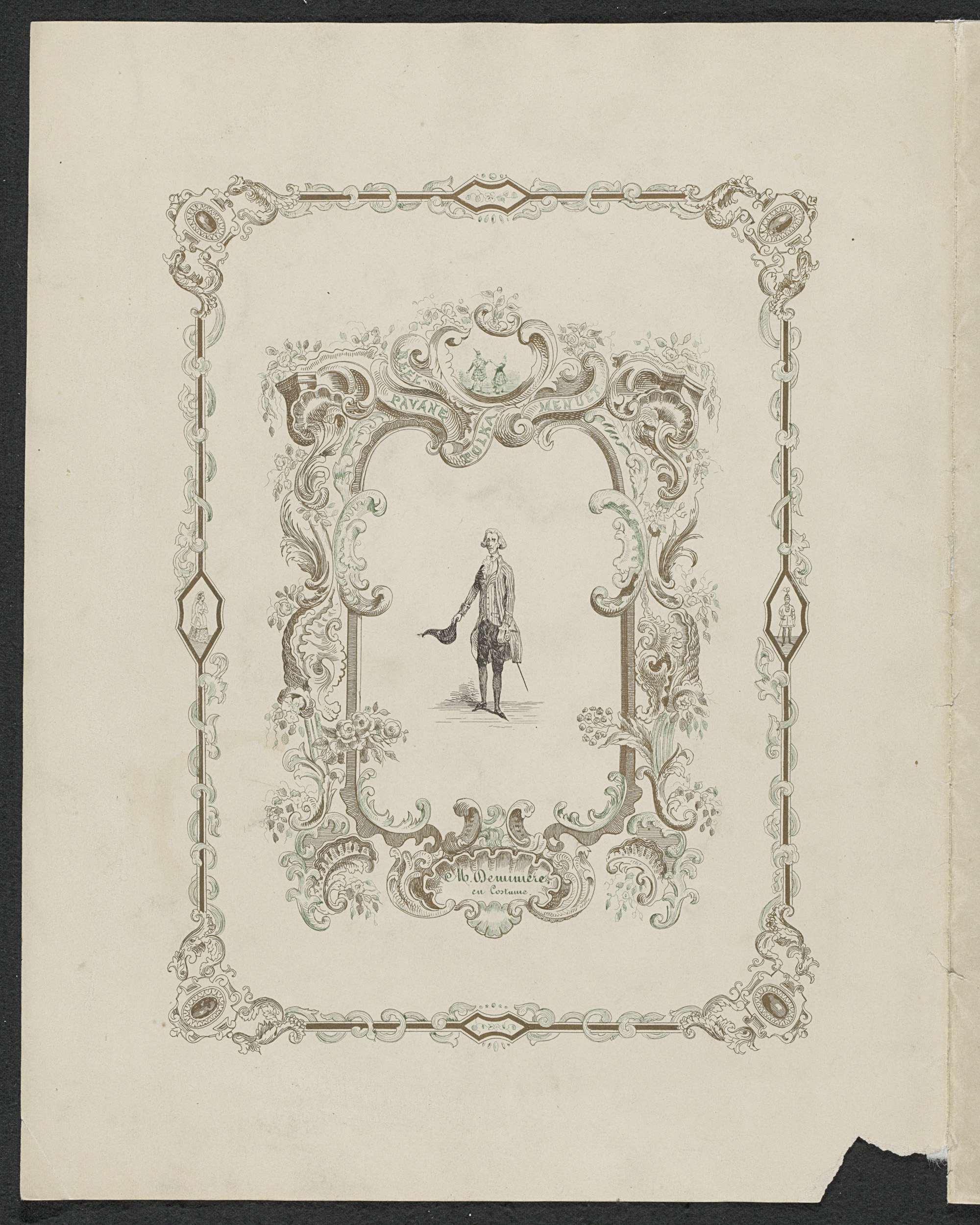 Achterzijde van een versierde papieren omslag gedrukt in goud en groen. Staande figuur van mr. Deminière, de Franse balletmeester aan het koninklijke hof, in kostuum, binnen ornamentele lijsten. Omslag om de gedrukte beschrijving door le Comte de Guldenlew van een gekostumeerd bal gehouden op het paleis van de prins van Oranje (de latere koning Willem ...